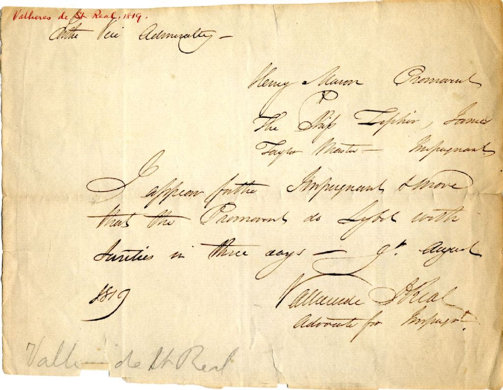Cause Henry Mann, demandeur, contre le navire Zephir et James Taylor, maître (master), défendeurs. Vallières de Saint-Réal, avocat des défendeurs, demande à ce que le demandeur donne des garanties