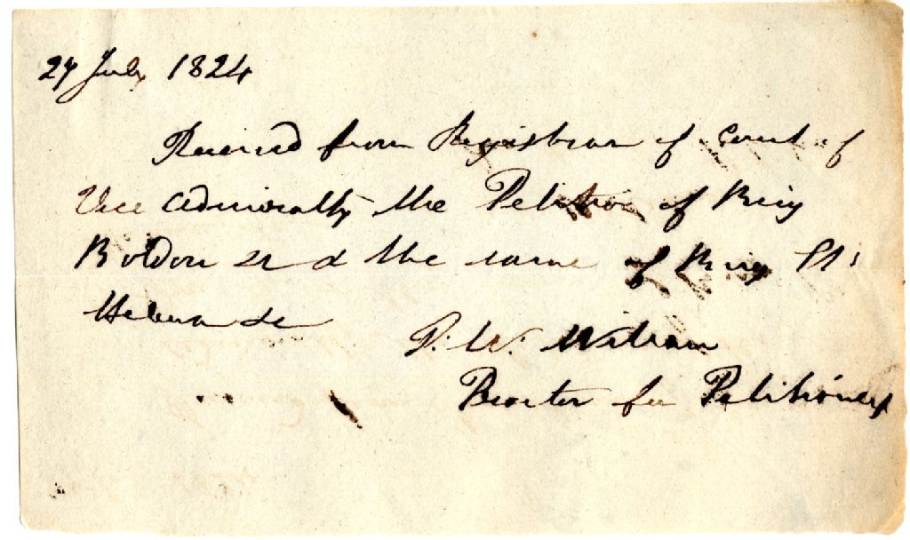 P. W. Wilson, procureur de King Bolden, reconnaît avoir reçu du greffier (registrar) de la Cour de Vice-Amirauté la requête de Bolden
