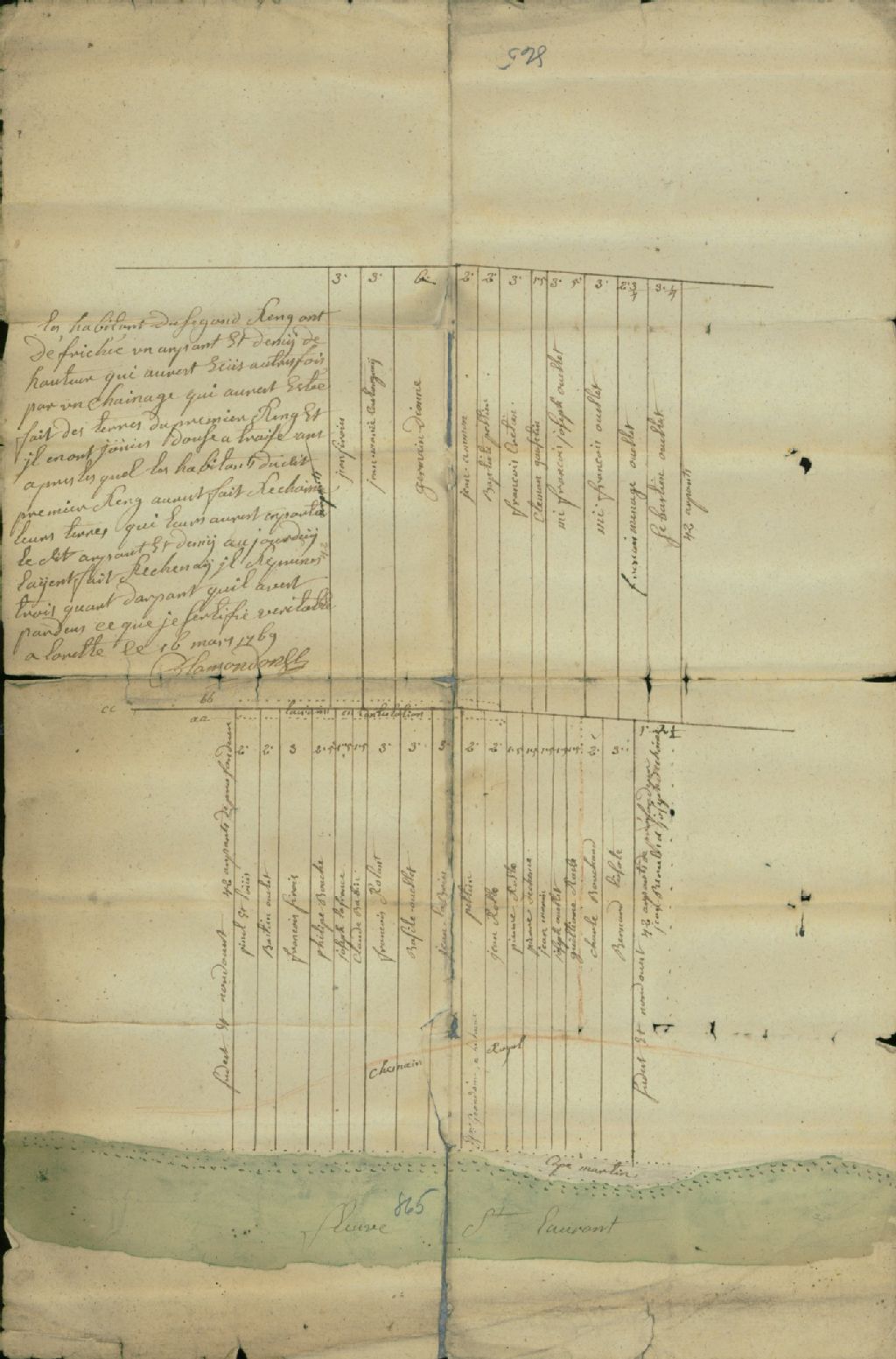 - Ce dossier en matières civiles provient de la Cour des plaidoyers communs. Il comprend une requête de Germain Dionne et consorts, réclamant que les habitants du premier rang de la seigneurie de La Pocatière soient tenus d'abandonner le terrain qui leur appartient en vertu des lignes marquées sur le plan figuratif, mention de monsieur [Samuel] Holland, écuyer, ingénieur général de la Province, un mandat d'assignation (warrant) à Jean Mignot dit Labrie, le nommé Peltier, Basile Ouellet, François Roland, Claude Babin, Joseph Lafrance et consorts, un exploit d'assignation en conséquence, un extrait du registre de la Cour des plaidoyers communs dans lequel ladite Cour ordonne qu'Ignace Plamondon, arpenteur nommé par les parties, procède à la vérification des anciennes bornes et au bornage des terres en question, une élection de domicile de Germain Dionne en sa maison sise à La Pocatière, un procès-verbal d'arpentage daté du 9 janvier 1770 dressé par ledit Plamondon, un billet de désistement de Basile Ouellet, Jean Labrie et Joseph Lafrance concernant le procès-verbal en question, une lettre signée par maître Saint-Aubin, notaire, concernant le procès-verbal d'arpentage, une ordonnance d'exécution sur les biens desdits Labrie, Ouellet, Roland et Babin, un reçu à la suite de ladite exécution de sentence, un second procès-verbal d'arpentage daté du 31 août 1770 dressé par le sieur Plamondon, en présence de Joseph Gaubaut, Charles Peltier et Bernard Peltier, anciens habitants de la paroisse de Saint-Roch, à la requête de Jean Labrie, Basile Ouellet, Bernard Sosier (Saucier) et Joseph Lafrance, une requête de Germain Dionne, Jean Siroy (Sirois), Clément Gausselin (Gosselin) et consorts, réclamant que lesdits Labrie, Ouellet, Roland et consorts soient condamnés à 300 shillings de dommages et intérêts en plus de remettre les terres qui leur appartiennent conformément au procès-verbal de Plamondon du 9 janvier 1770 qui a été homologué par la Cour, un exploit de signification de requête audits Labrie, Ouellet et Roland, un mandat d'assignation audits Labrie, Ouellet et Roland, un exploit d'assignation en conséquence, un mandat d'assignation à Germain Dionne et consorts, un exploit d'assignation en conséquence, un billet de Jacques Pinguet, avocat, réclamant que les défendeurs soient renvoyés de la nouvelle action intentée contre eux, une requête de Jean Mignot dit Labrie et consorts, réclamant que Germain Dionne et consorts lui paient la somme de 362 shillings en vertu d'une transaction, un exploit de signification de requête audits Dionne et consorts, un second extrait de la Cour des plaidoyers communs dans lequel la Cour déclare que l'acte de transaction en question est nul, condamnant ainsi ledit Labrie et consorts aux dépens, un troisième procès-verbal d'arpentage daté du 4 septembre 1771 dressé par le sieur Plamondon et un acte de déclaration et de protestation.Le dossier comprend aussi un plan des 1er et 2e rangs situés dans la seigneurie Saint-Denis-de-Sainte-Anne réalisé par Ignace Plamondon père le 16 mars 1769. Y figurent une partie de cette seigneurie, le fleuve Saint-Laurent, le cap Martin, le chemin Royal, la dimension des lots, le relief et le nom de 30 individus. Les anciennes cotes de ce document sont: T50,S301 et TL15 no 865