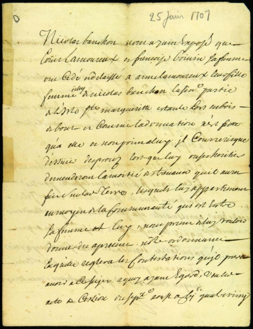 Ordonnance précisant que les travaux réalisés par Nicolas Bachand sur la terre de sa femme Anne Lamoureux, lui resteront en propre, 25 juin 1707, Archives nationales à Montréal, Fonds Juridiction royale de Montréal, (06M,TL4,S1,D1029).