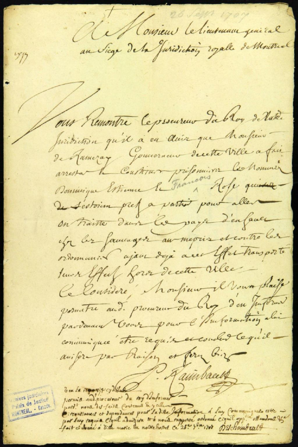 - Ce dossier de matière criminelle est composé des pièces suivantes : la requête pour la tenue d'une information judiciaire concernant l'arrestation par de Ramezay des nommés Dominique Étienne et François Rose, accusés d'avoir préparé une expédition illégale de traite chez les sauvages ; les assignations aux témoins ; le cahier contenant les " Informations judiciaires " du 26 septembre au 5 octobre 1707 ; les interrogatoire de Dominique Étienne demeurant chez Nicolas Perthuis, son beau-père et de François Rose, demeurant chez la veuve Prudhomme ; l'ordre de répétition des interrogatoires ; ladite répétition ; la requête de Dominique Étienne pour son élargissement de prison avec cautionnement par Jean-Baptiste Ménard ; l'ordre de "relaxer" Étienne avec cautionnement ; la comparution de Jean-Baptiste Ménard ; la requête pour surseoir à la "relaxation" de Étienne ; la sentence d'élargissement avec défense de quitter la ville ; la requête de Rose et d'Étienne pour leur élargissement de prison ; les conclusions définitives pour la confiscation des marchandises de traite ; le dictum de sentence d'élargissement des prisons avec confiscation et vente des marchandises confisquées ; le procès-verbal de vente des marchandises confisquées avec la liste des noms des enchérisseurs et l'ordonnance de l'intendant Jacques Raudot concernant la disposition des deniers provenant de la vente des marchandises confisquées.Plusieurs témoins sont mentionnés dans cette affaire : Marie-Anne Chasle, 35 ans, veuve de Pierre Prudhomme ; Michel Brouillet dit Laviolette, 60 ans, meunier, de Sainte-Anne ; Marie Dubois, épouse de Michel Brouillet ; Jacques Cauchois, 52 ans, marchand ; Jacques-Charles de Couagne, bourgeois ; Pierre Crépeau, frère Hospitalier à l'Hôpital général ; Antoine Barrois, 24 ans, demeurant à l'Hôpital général et Simon Baillargé, 24 ans, voyageur, de Boucherville