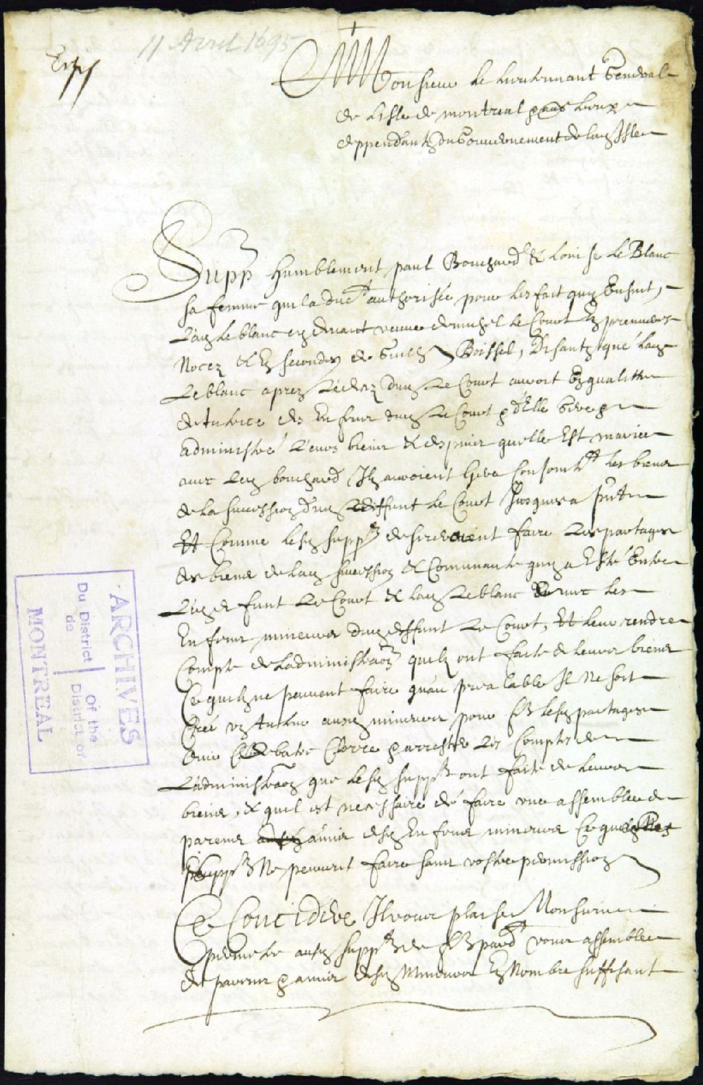 - Ce dossier d'administration judiciaire est composé des pièces suivantes : une requête de Paul Bouchard et de sa femme, Louise Leblanc, veuve de Michel Lecours, pour tenir une assemblée de parents et amis en vue d'élire un tuteur aux enfants Lecours, mineurs; l'accord de Charles Juchereau, lieutenant général; l'assignation par l'huissier Georges Pruneau aux personnes suivantes: René Cuillerier; Louis Chevalier; Claude Robillard; Pierre Verrier Lasolaye; Pierre Prudhomme et André de Chaumes