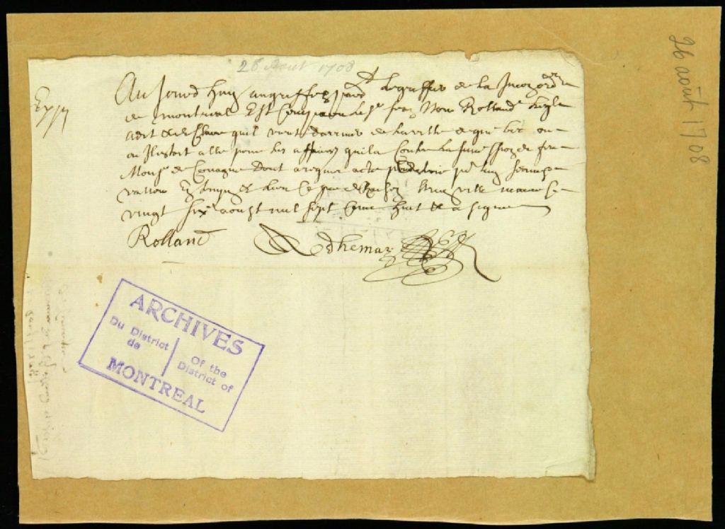 - Ce dossier de matière civile est composé de la déclaration de François Lenoir dit Rolland au greffe de la juridiction royale de Montréal à l'effet qu'il vient d'arriver de la ville de Québec où il était allé pour son appel au Conseil Souverain dans une cause contre la succession de Charles de Couagne