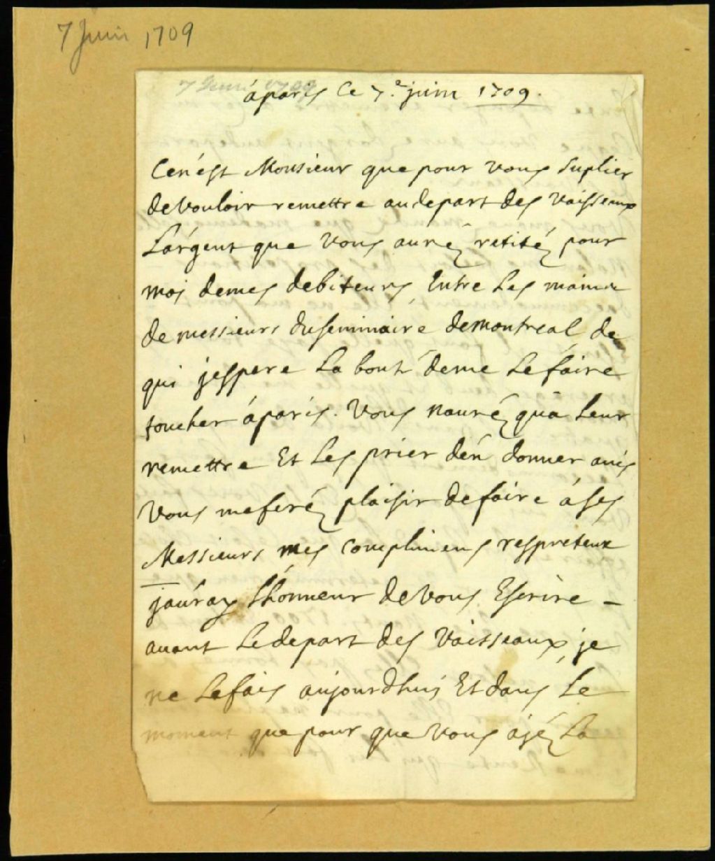 Lettre de Louis Tantouin de LaTouche, Paris, à Pierre Raimbault pour récupérer l'argent de créances, 7 juin 1709, Archives nationales à Montréal, Fonds Juridiction royale de Montréal, (06M,TL4,S1,D1162).