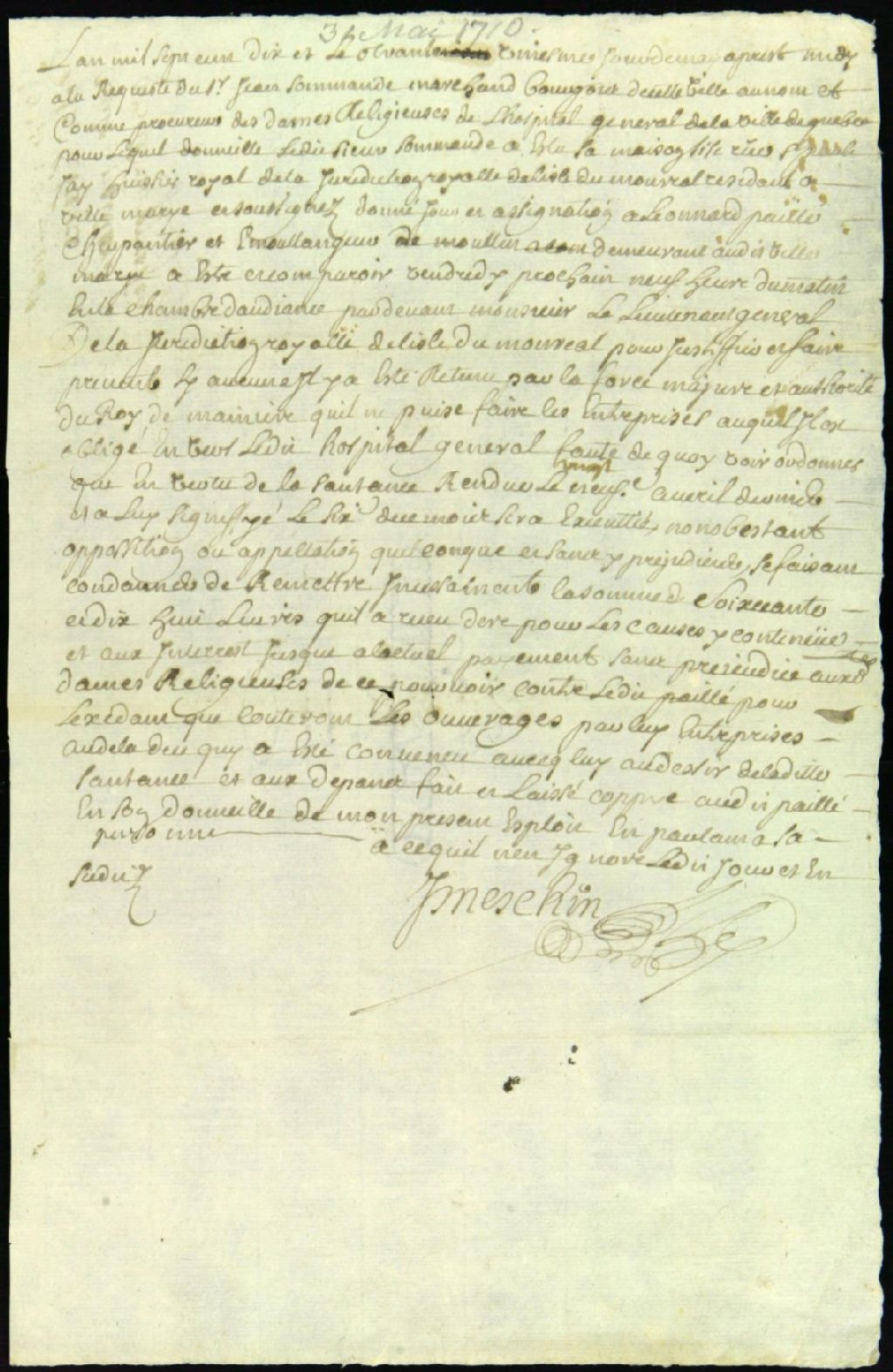 - Procès entre l'Hôpital général de Québec, représenté par Jean Soumande, demandeur, et Léonard Paillé dit Paillard, charpentier, défendeur, pour le respect d'un marché lié à des travaux de charpente
