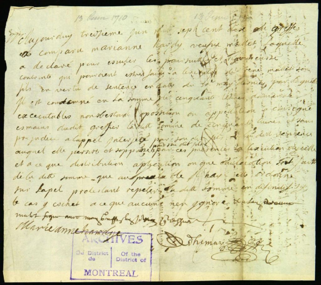 Consignation au greffe d'une somme d'argent par Marie-Anne Hardy, veuve de Pierre Mallet, pour une amende due par son fils René Mallet, 13 juin 1710 - 11 juillet 1710, Archives nationales à Montréal, Fonds Juridiction royale de Montréal, (06M,TL4,S1,D1230).