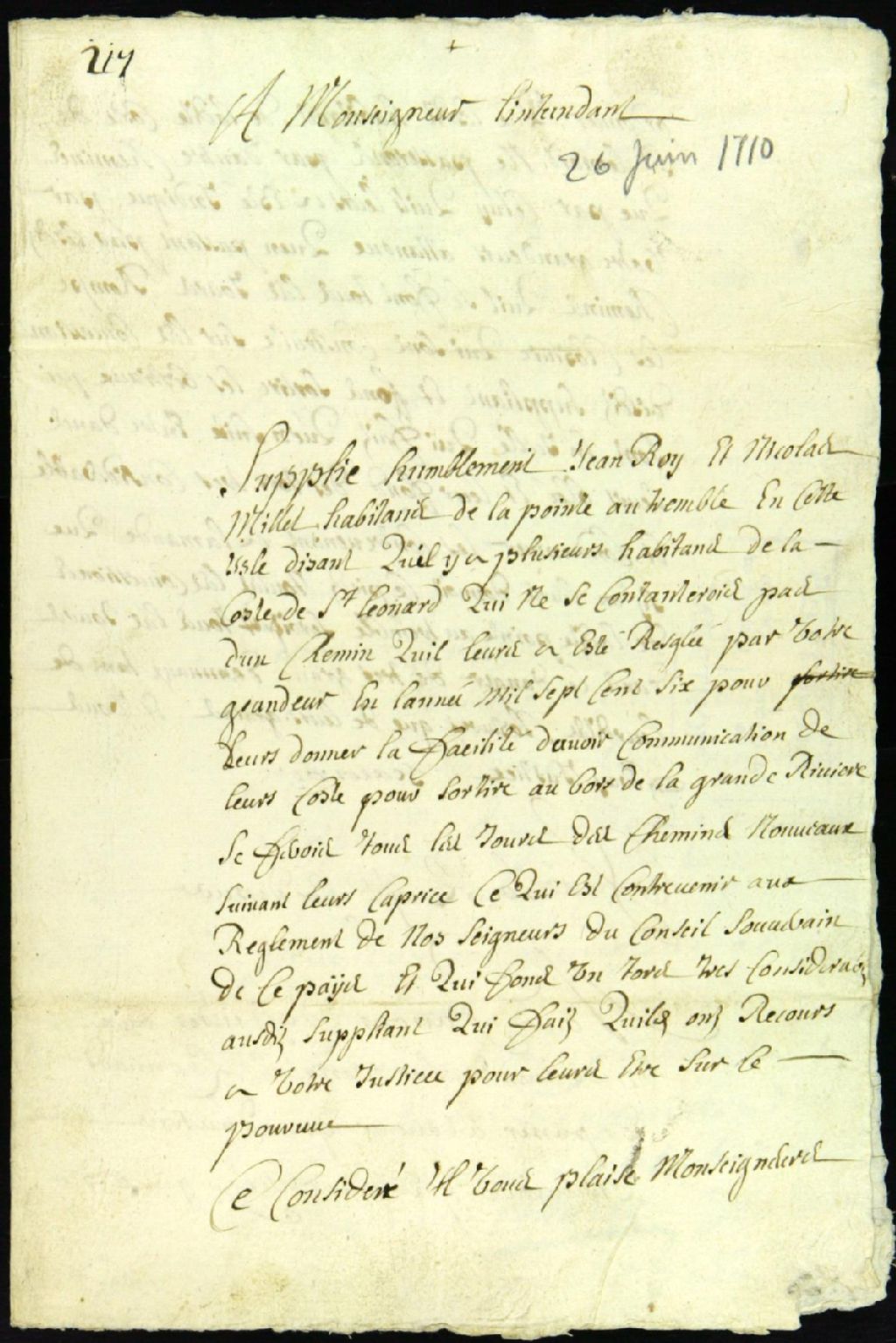 - Ce dossier d'administration civile est composé des pièces suivantes : l'ordonnance de Antoine-Denis Raudot défendant aux habitants de la Côte-Saint-Léonard de passer ailleurs que sur le chemin spécifié dans l'ordonnance émise par son père Jacques Raudot, intendant en l'année 1706 , suite à la requête de Jean Roy et Nicolas Millet se plaignant des dommages causés à leurs terres; le procès-verbal de la publication de l'ordonnance à la porte de l'église de la Pointe-aux-Trembles et l'ordre de l'intendant à Nicolas Senet, notaire, de visiter le chemin de la rivière des Prairies et faire rapport au sujet de la plainte de Sabourin et des autres habitants