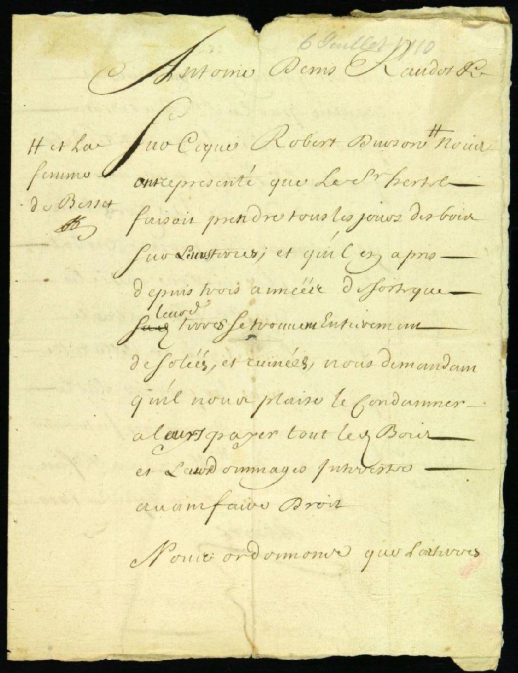 - Ce dossier de matière civil est composé de l'ordre de l'intendant Antoine-Denis Raudot dans le règlement d'un différend entre Robert Durson [?], sa femme et le sieur Hertel, lequel est accusé d'avoir pris du bois sur la terre du demandeur depuis plusieurs années. L'intendant ordonne que Volant de Radisson visitera les terres du plaignant pour évaluer la valeur du bois enlevé par Hertel et fera rapport au sieur Raimbault