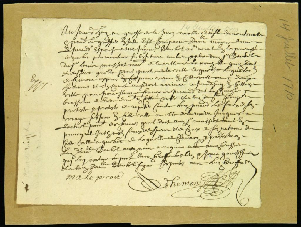 - Ce dossier de matière civile est composé de la comparution au greffe de la Juridiction royale de Montréal de Marie-Anne Picard, épouse de Jacques Barbel, procuratrice pour le sieur Louis Massiot, marchande de LaRochelle, laquelle déclare être arrivée de Québec en ce jour afin de poursuivre François Picard dit Laroche pour remboursement de dettes