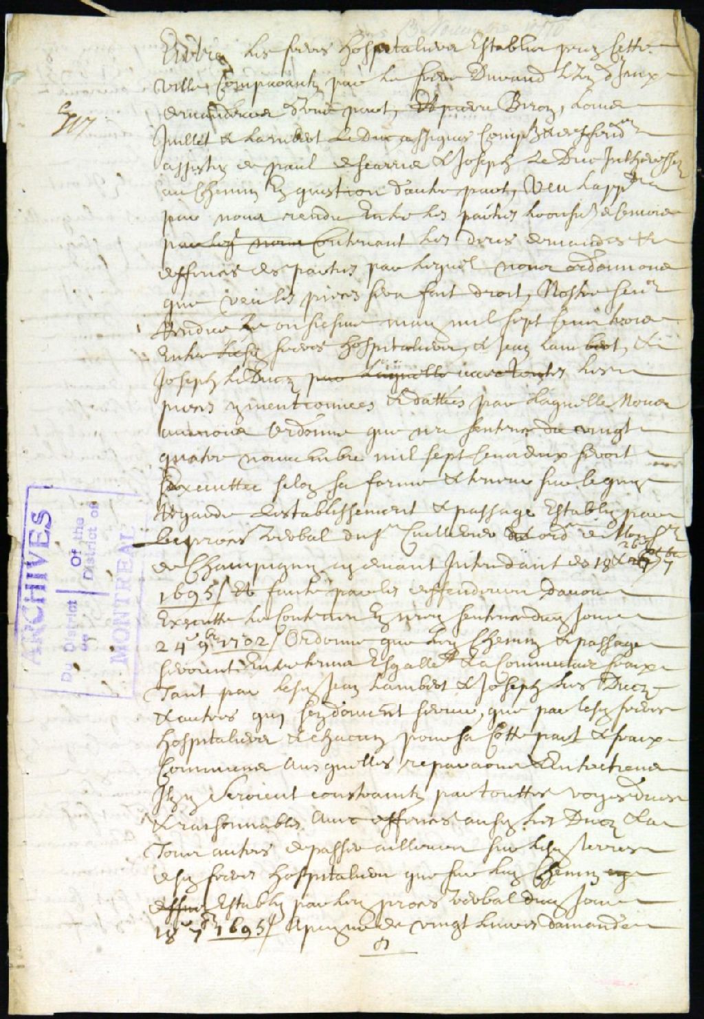 Procès entre frères Hospitaliers, demandeurs, et Pierre Biron, Louise Juillet, Paul Descaries et Joseph Leduc, défendeurs, pour le rétablissement de l'ancien chemin des tanneries et la reconstruction d'une clôture, 13 novembre 1710, Archives nationales à Montréal, Fonds Juridiction royale de Montréal, (06M,TL4,S1,D1266).