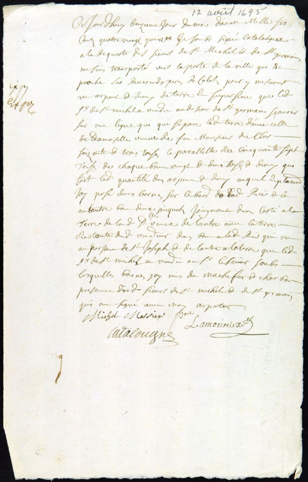 - Ce dossier d'administration judiciaire est composé de la pièce suivante : le procès-verbal de bornage, par Gédéon de Catalogne, d'un emplacement situé près de la porte de la ville qui est proche des pères Récollets, lequel a été vendu par Michel Messier à Pierre Lamoureux dit Saint-Germain, suivant le contrat passé chez le notaire Adhémar