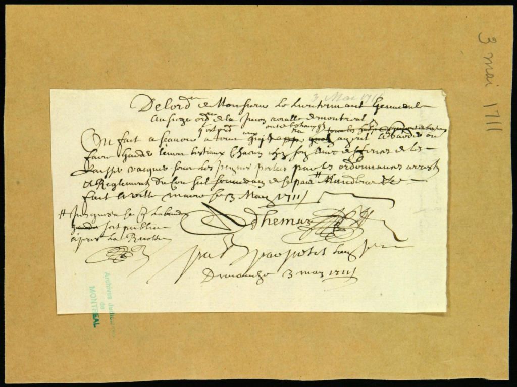 - Ce dossier d'administration civile est composé du texte rédigé comme suit : " De l'ordonnance du lieutenant général on fait savoir à tous ceux qui ont des bestiaux à garder ou qui gardent des bestiaux de les faire garder chacun chez soi avec défense de les laisser vaquer sous les peines portées aux ordonnances ". C'est lu le dimanche 3 mai 1711 par Jean Petit, huissier, et c'est signé Jacques-Alexis Fleury de Deschambault