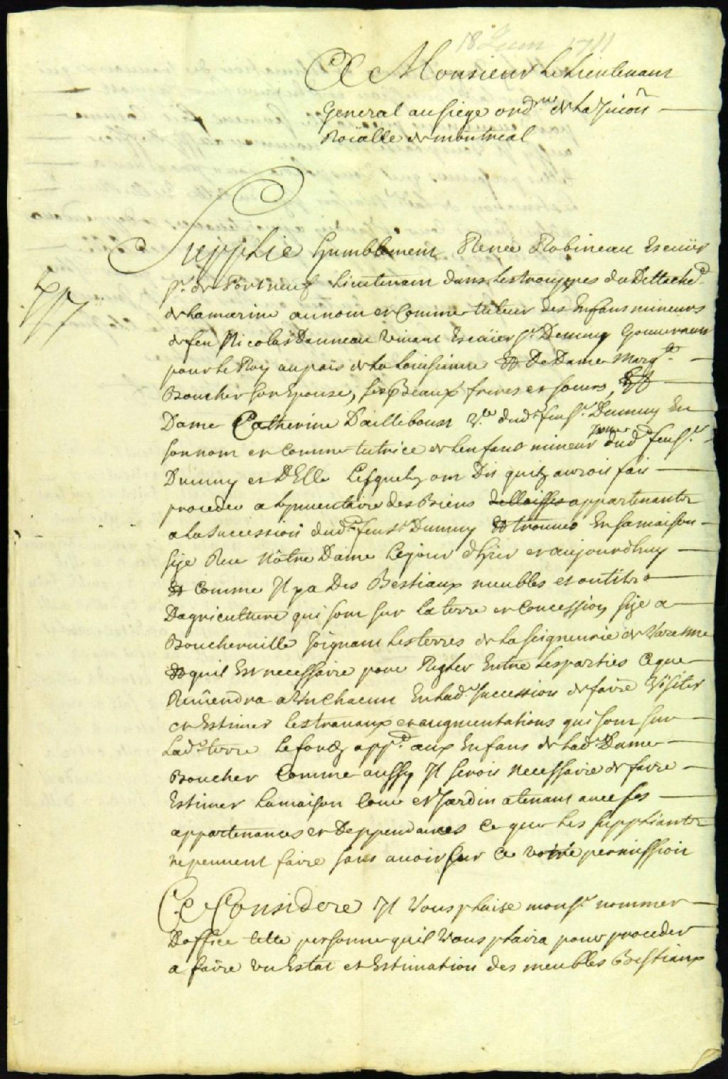 - Ce dossier d'administration judiciaire est composé des pièces suivantes : la requête adressée au lieutenant général par René Robineau, sieur de Portneuf, en sa qualité de tuteur des enfants mineurs de feu Nicolas Daneau et de défunte dame Marguerite Boucher, et à la requête de Catherine d'Ailleboust, disant avoir terminé l'inventaire des biens et requérant la nomination d'arbitres par justice pour procéder à l'évaluation des biens et augmentations des travaux; la permission et la nomination des arbitres Étienne Trudeau, Pierre Couturier, maçon, architecte et Louis Chevrefils dit Bélisle, charpentier; le rapport d'arbitres pour la maison de ville et le jardin et le rapport des arbitres Gilles Papin et Joseph Bénard pour la valeur de la concession située à Boucherville