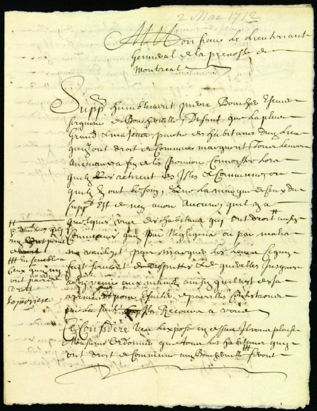 - Ce dossier d'administration civile est composé de l'ordonnance à tous les habitants de Boucherville,par le lieutenant général Deschambault de la Prévôté de Montréal de marquer leurs animaux qui vont dans la commune, suite a une plainte de leur seigneur, Pierre Boucher. Boucher de LaPerrière est signataire de ce document