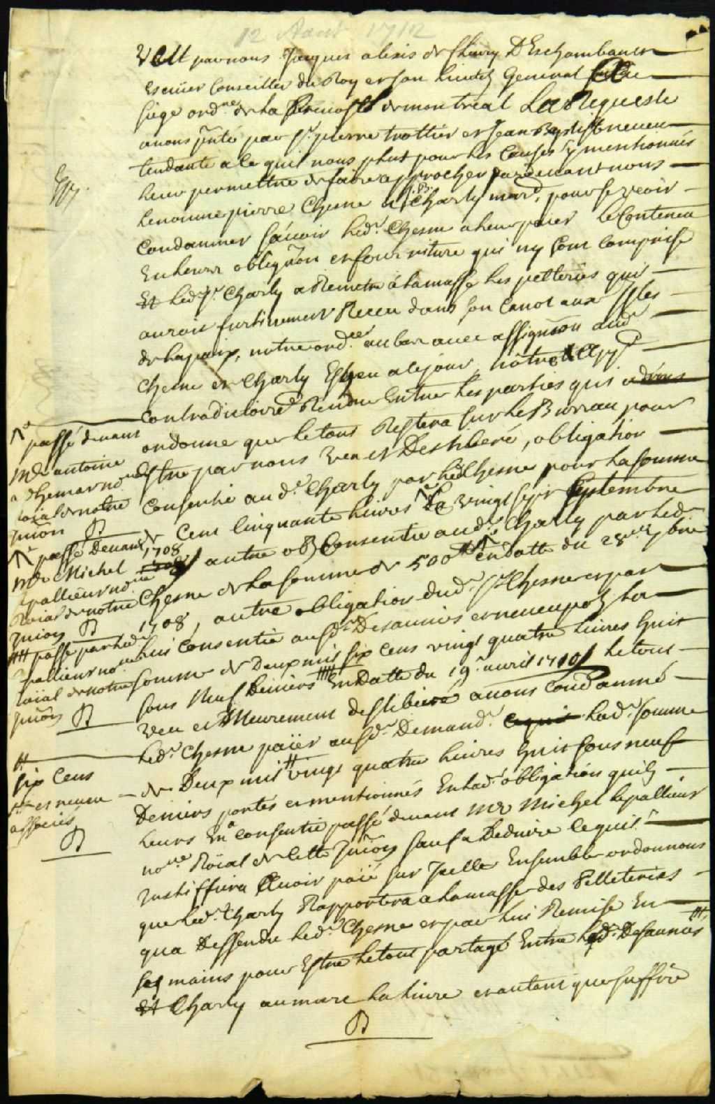 Procès entre Pierre Trottier et Jean-Baptiste Neveu, demandeurs, et Pierre Chesne et Jean-Baptiste Charly, marchands, défendeurs, pour le paiement d'une obligation, 12 août 1712, Archives nationales à Montréal, Fonds Juridiction royale de Montréal, (06M,TL4,S1,D1380).