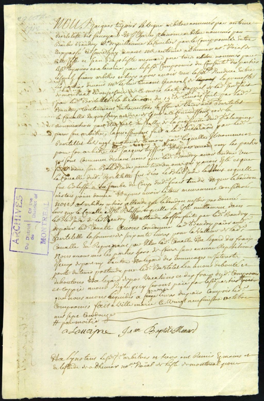 - Ce dossier de matière civile est composé des pièces suivantes : la sentence arbitrale par Jacques Tessier dit Lavigne, Charles Alavoine et Jean-Baptiste Ménard, nommés pour régler un différend entre Antoine Berthelet et Barbe Beaudry pour le remboursement d'une cavale blessée par un fusil tendu dans le champ de blé d'Inde de cette dernière, placé dans l'espoir de tuer un ours qui y rôde la nuit ; la remise du procès-verbal au notaire Adhémar pour le déposer au rang de ses minutes ; et la quittance à Barbe Beaudry