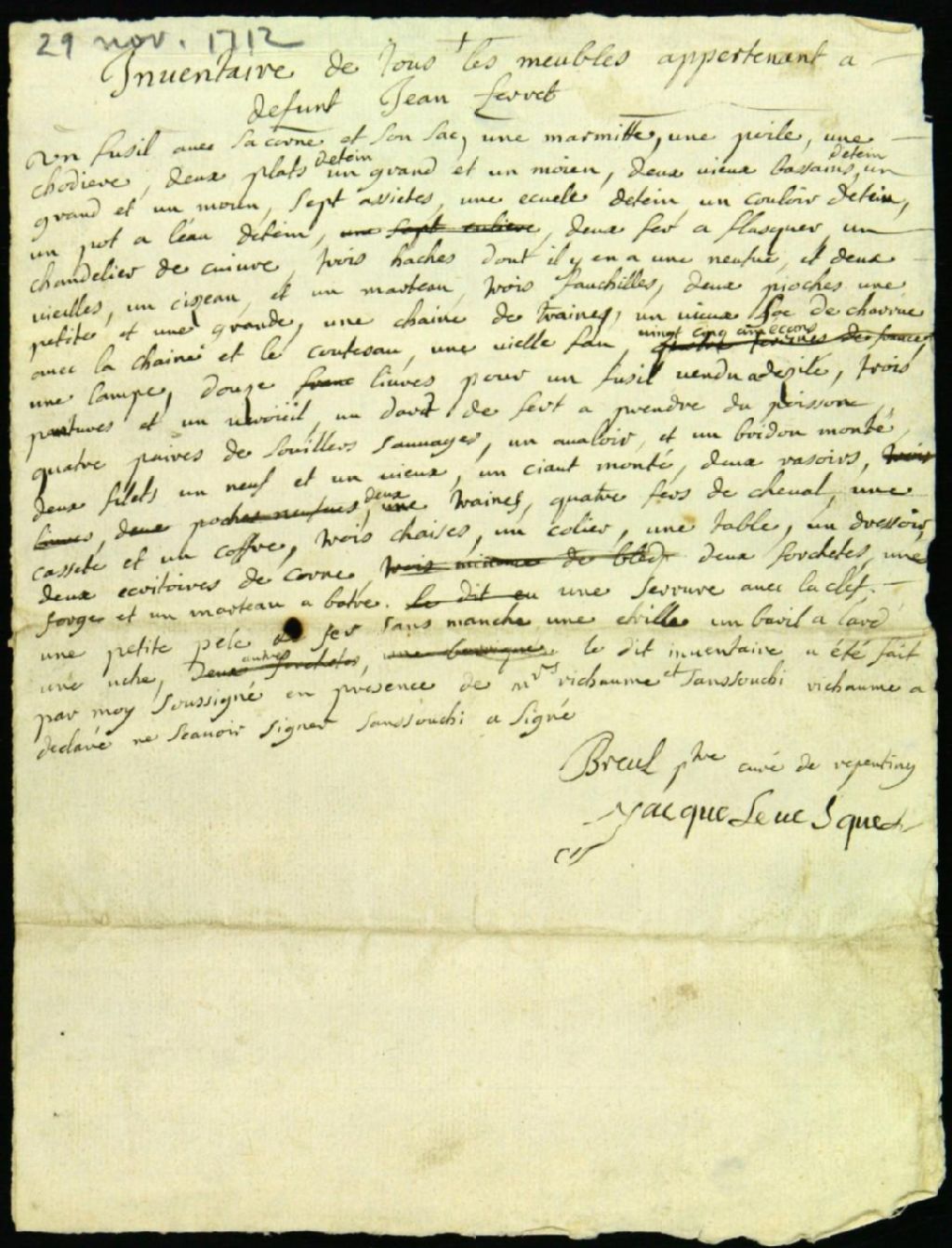 - Ce dossier d'administration judiciaire est composé de la pièce suivante : l'inventaire de tous les biens meubles de défunt Jean Ferré, par le curé Breul. Jacques Levesque dit Sansoucy est témoin dans cet inventaire