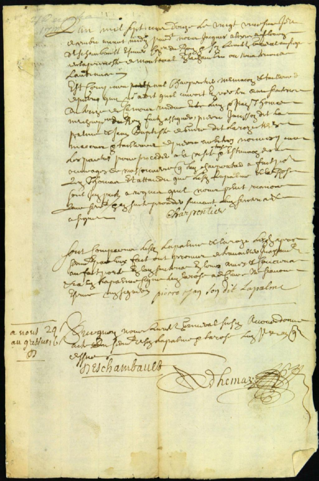 - Procès entre Jean Thomas, maître charpentier du roi, demandeur, et Paul Charpentier, tailleur de pierre et maçon, défendeur, au sujet de travaux