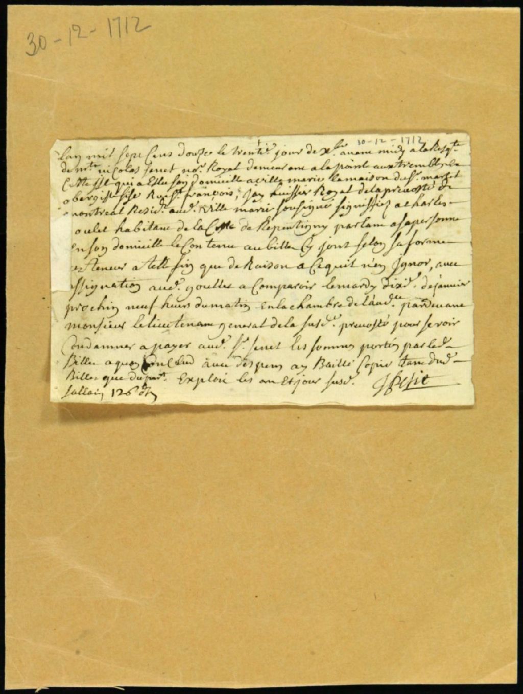 Procès entre Nicolas Senet, notaire royal, demandeur, et Charles Goulet, habitant de Repentigny, défendeur, pour dette, 30 décembre 1712, Archives nationales à Montréal, Fonds Juridiction royale de Montréal, (06M,TL4,S1,D1412).