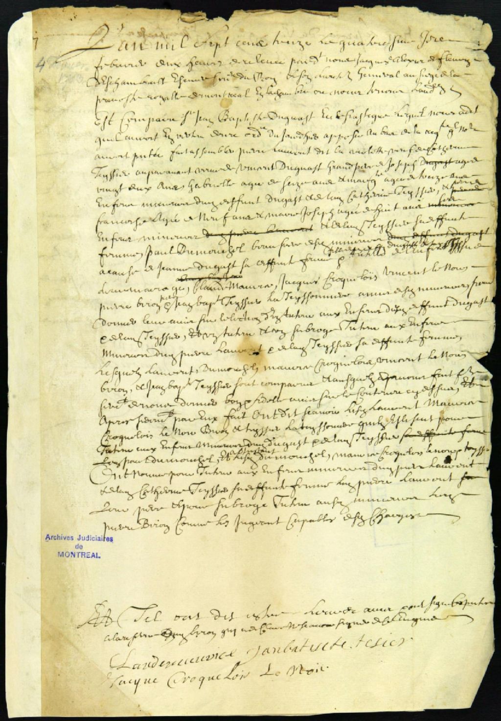 - Ce dossier de matière civile est composé des pièces suivantes : le procès-verbal de tutelle des enfants de Vincent Dugas et de ceux de Pierre Laurent, à la requête de Jean-Baptiste Dugas, poursuivant le partage des biens de sa défunte belle-mère, Catherine Tessier ; le jugement ordonnant aux parties de se rendre mutuellement compte de leurs revenus d'héritages ; le procès-verbal de nomination des arbitres Paul Bouchard, Jacques Cardinal et Claude Cécire ; le tirage au sort des lots et l'évaluation ; le jugement ordonnant la vente par licitation des deux emplacements de terre situés à Montréal et Lachine ; les affiches et publications des trois criées faites à Lachine et Montréal, ainsi que la mise à prix par le sieur Lepailleur, procureur de Jean-Baptiste Dugas ; la requête de Pierre Laurent opposant pour un montant de 300 livres payées à même son salaire chez l'intendant à Fleury, sieur de LaGorgendière, pour les dettes qu'il a contractées du temps de la communauté de bien avec la défunte Tessier ; l'ordre des communications aux parties et la signification