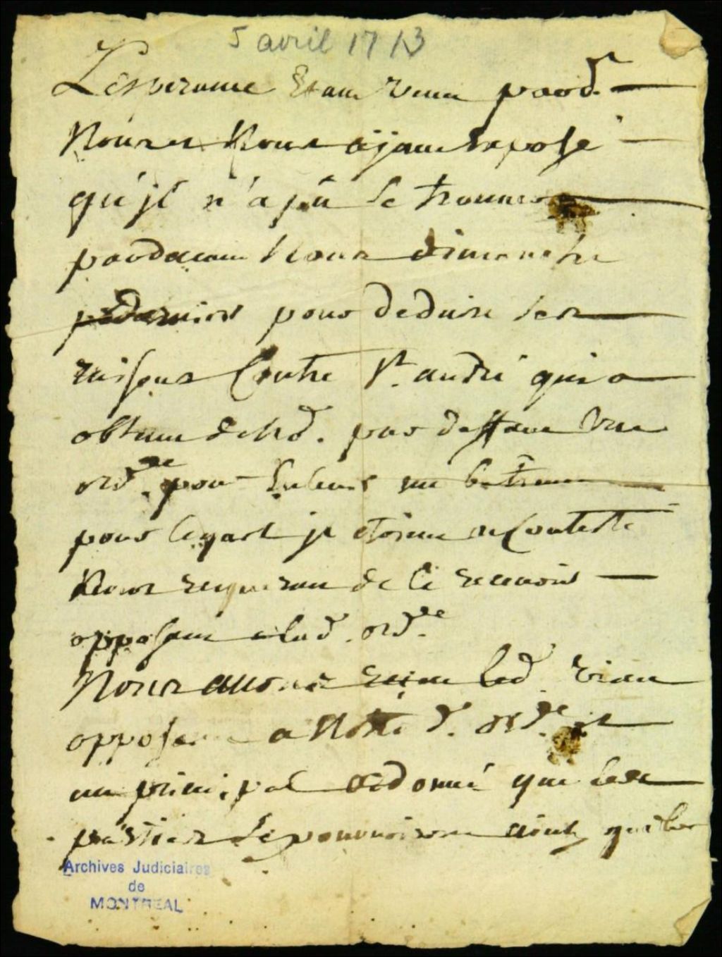 Procès entre le nommé Saint-André, de Côte-Saint-Martin, demandeur, et Jacques Viau dit Lespérance, habitant la baronnie de Longueuil, défendeur, 5 avril 1713 - 16 avril 1713, Archives nationales à Montréal, Fonds Juridiction royale de Montréal, (06M,TL4,S1,D1433).