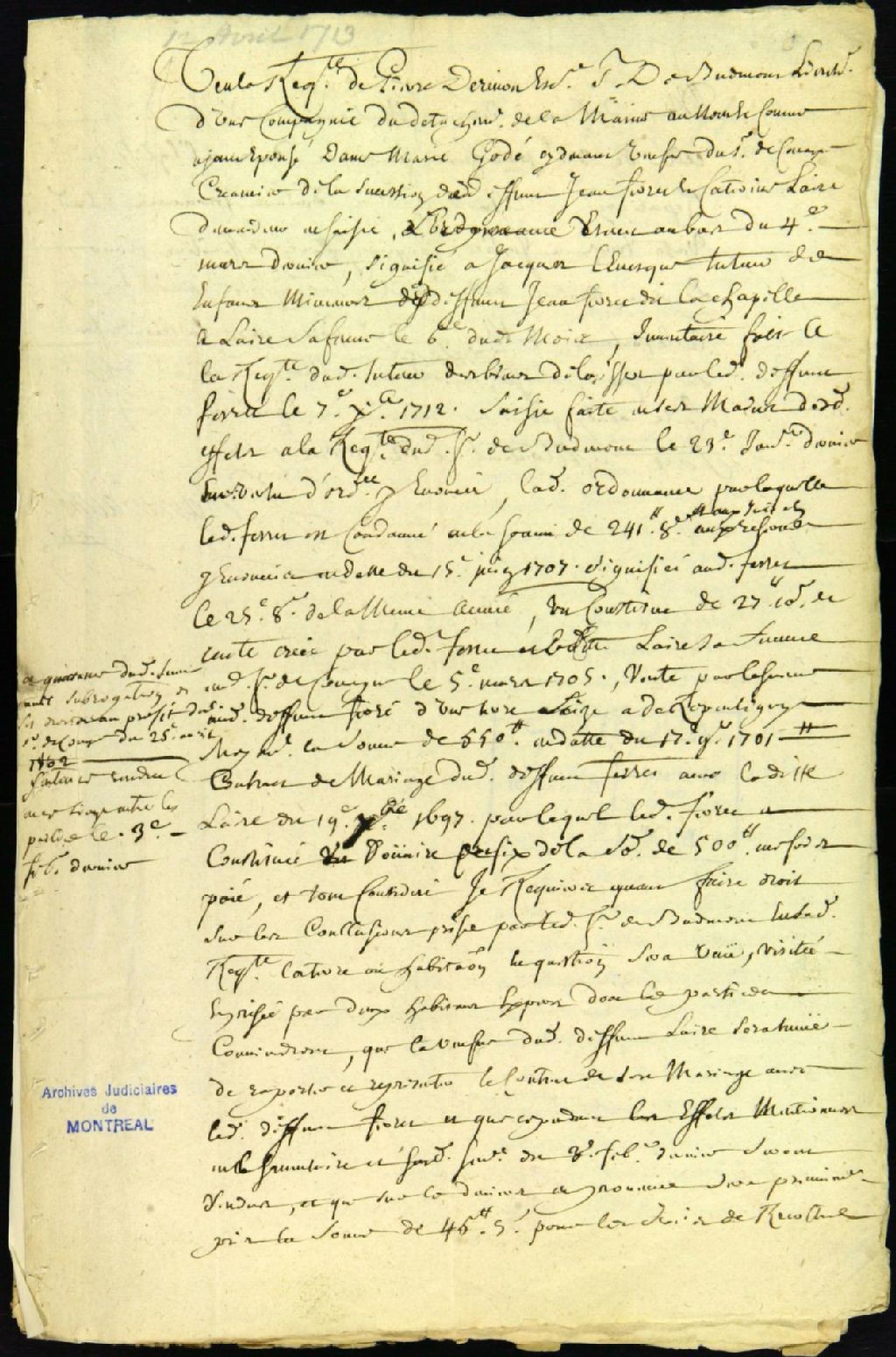Procès entre Pierre Derivon, sieur de Budemont, lieutenant d'une compagnie des troupes de la marine, époux de Marie Godé, veuve de Charles de Couagne et tutrice de leurs enfants, demandeurs, et Jacques Lévesque, habitant de Repentigny, tuteur des enfants mineurs des défunts Jean Ferré dit Lachapelle et Catherine Lair, défendeur, pour une saisie sur dettes, 12 avril 1713 - 2 septembre 1713, Archives nationales à Montréal, Fonds Juridiction royale de Montréal, (06M,TL4,S1,D1436).