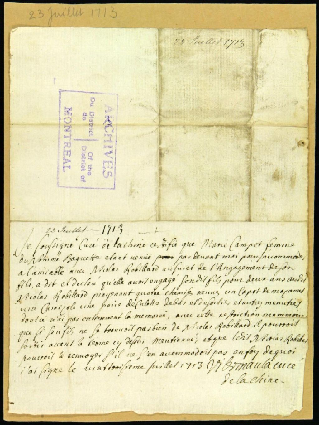 Entente sous seing privé conclue entre Marie Campeau, veuve de Debien et épouse de Julien Perusie dit Baguette, et Nicolas Robillard, pour l'engagement du fils de celle-ci, 23 juillet 1713, Archives nationales à Montréal, Fonds Juridiction royale de Montréal, (06M,TL4,S1,D1468A).