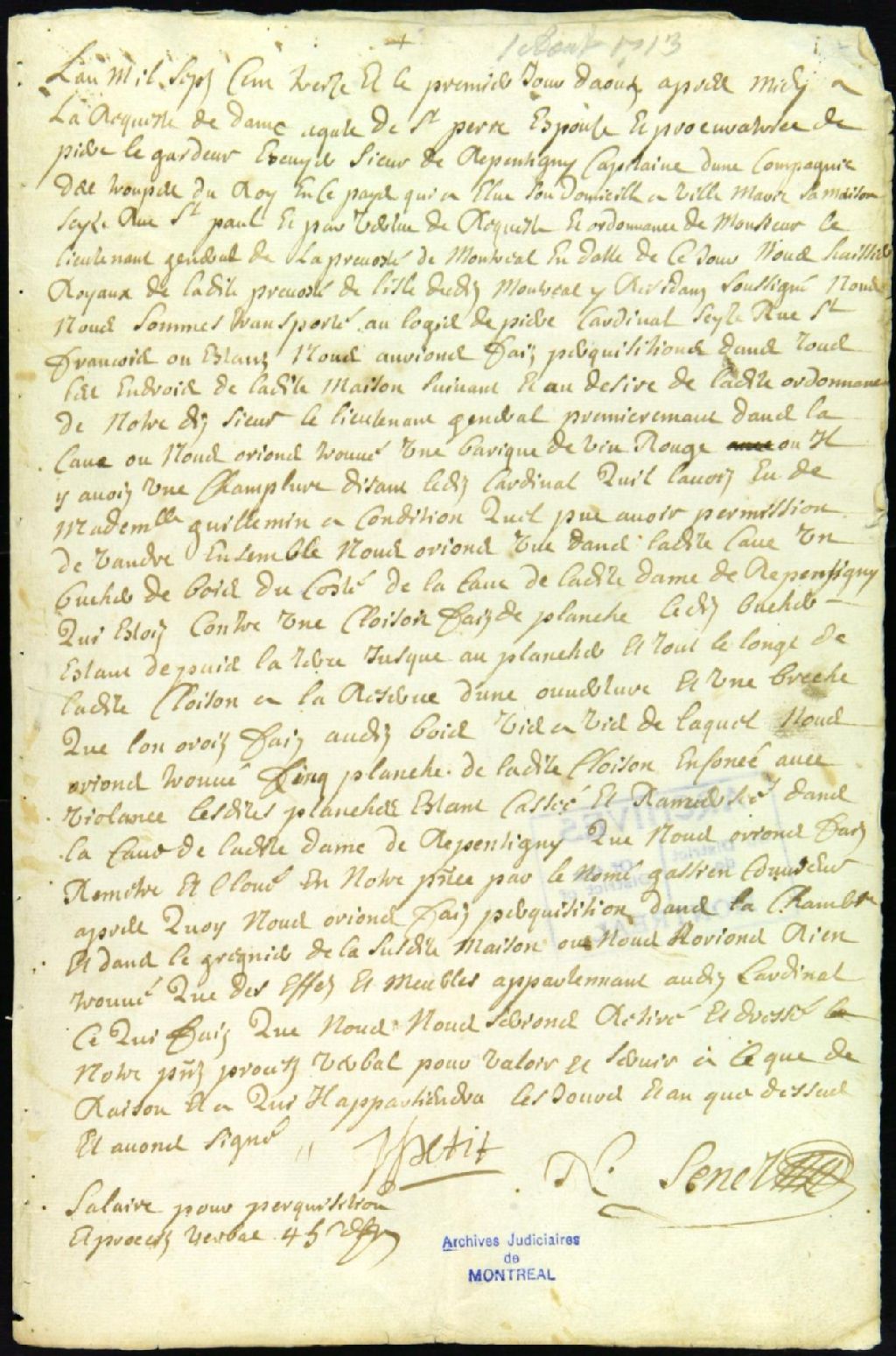- Ce dossier de matière criminelle est d'abord composé de la plainte de dame Agathe de Saint-Père contre son locataire Pierre Cardinal, 26 ans, occupant de la maison voisine de la sienne, accusé d'avoir pénétré dans sa demeure par un trou pratiqué dans sa cave et d'avoir volé des peaux de castors. Elle demande de faire visiter les lieux par la justice et la tenue d'une information judiciaire. Le dossier contient aussi le procès-verbal de la visite des lieux par Nicolas Senet et Jean Petit ; l'ordre d'assigner les témoins et les assignations; l'information judiciaire ; la requête pour l'interrogatoire du couple Cardinal ; l'ordre d'assigner Cardinal et les assignations ; les interrogatoires de Pierre Cardinal sa femme, Madeleine César, 35 ans ; la transcription intégrale des interrogatoires des accusés ; les dires et faits de la dame de Saint-Père faisant suite à la lecture des interrogatoires des accusés et le dictum de sentence d'expulsion des locataires avec obligation de réparer la brèche dans la cave.Plusieurs témoins sont mentionnés dans cette affaire : Jean Pothier dit Laverdure, 42 ans, taillandier ; Jacques-Charles de Couagne, marchand ; Jean Deslandes dit Champigny, 24 ans, maçon et Marie-Marguerite Pilet, 30 ans, épouse de Marcheteau. Les documents citent aussi Alexis Tabault, logeant chez Cardinal ; Champagne, soldat de la compagnie Repentigny, logeant aussi chez Cardinal et Lafontaine, soldat de la compagnie Repentigny