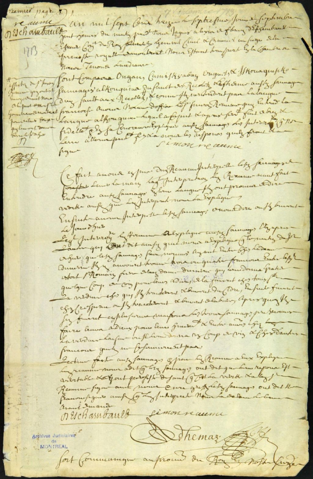 Procès contre François Lamoureux dit Saint-Germain, armurier, accusé de vente d'eau de vie à des sauvages, 7 septembre 1713 - 16 octobre 1713, Archives nationales à Montréal, Fonds Juridiction royale de Montréal, (06M,TL4,S1,D1483).