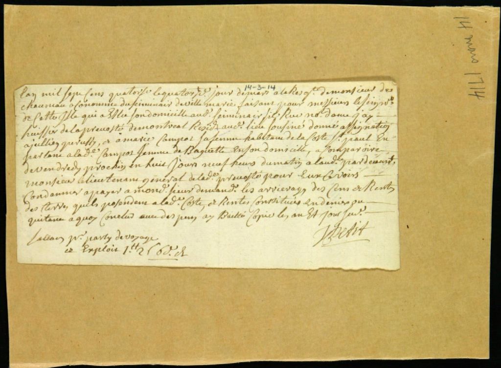 Procès entre Citoys de Chaumaux, économe du Séminaire, demandeur, et Julien Pérusie et sa femme Marie Campeau, habitants de la côte Saint-Paul, défendeurs, pour payement de cens et rentes, 14 mars 1714, Archives nationales à Montréal, Fonds Juridiction royale de Montréal, (06M,TL4,S1,D1553).