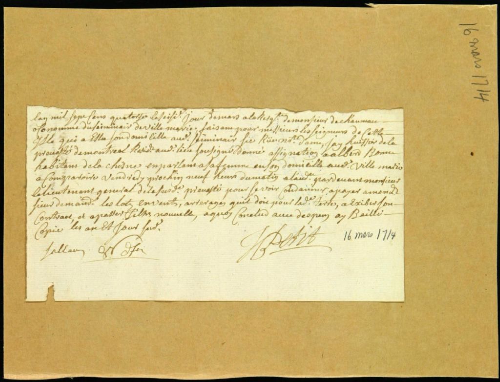 Procès entre Citoys de Chaumaux, économe du Séminaire, demandeur, et Albert Beaune, défendeur, pour payement de lods et ventes, 16 mars 1714, Archives nationales à Montréal, Fonds Juridiction royale de Montréal, (06M,TL4,S1,D1555).