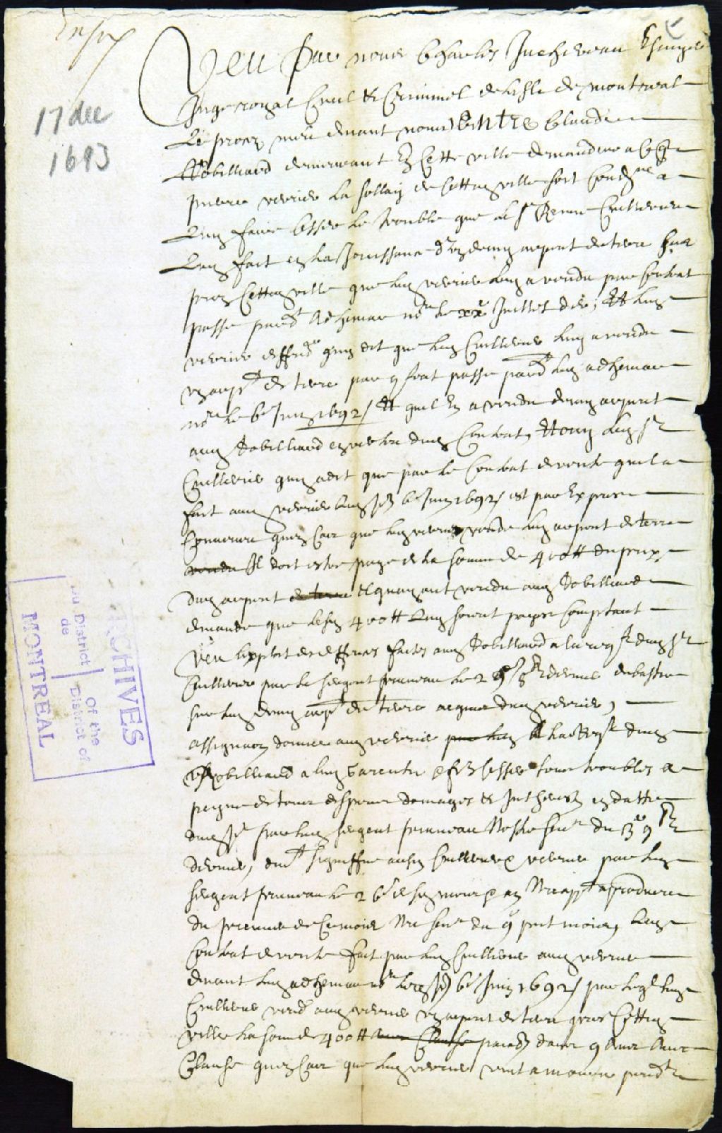 - Ce dossier de matière civile se compose des pièces suivantes: le dictum de sentence dans le règlement d'un différend entre Claude Robillard et Pierre Verrier, au sujet de la libre jouissance d'une terre acquise le 6 juin 1692 , par un contrat passé devant le notaire Adhémar, sur laquelle terre René Cuillerier possède encore des droits. On y a inclus la note de frais, taxes et dépenses; la transcription d'un acte signé par le notaire Adhémar, daté le 27 janvier 1694, par lequel Pierre Verrier délaisse à Claude Robillard le demi arpent de terre supplémentaire de René Cuillerier, pour la somme supplémentaire de 200 livres, payable directement à ce dernier