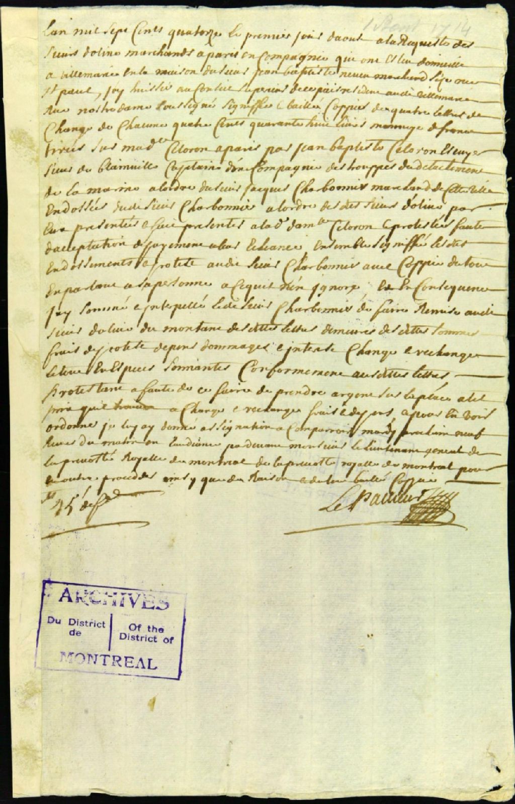Procès entre Doline, marchand de Paris, demandeur, et Jacques Charbonnier, marchand, défendeur, pour le remboursement de quatre lettres de change, 1 août 1714 - 18 août 1714, Archives nationales à Montréal, Fonds Juridiction royale de Montréal, (06M,TL4,S1,D1600).