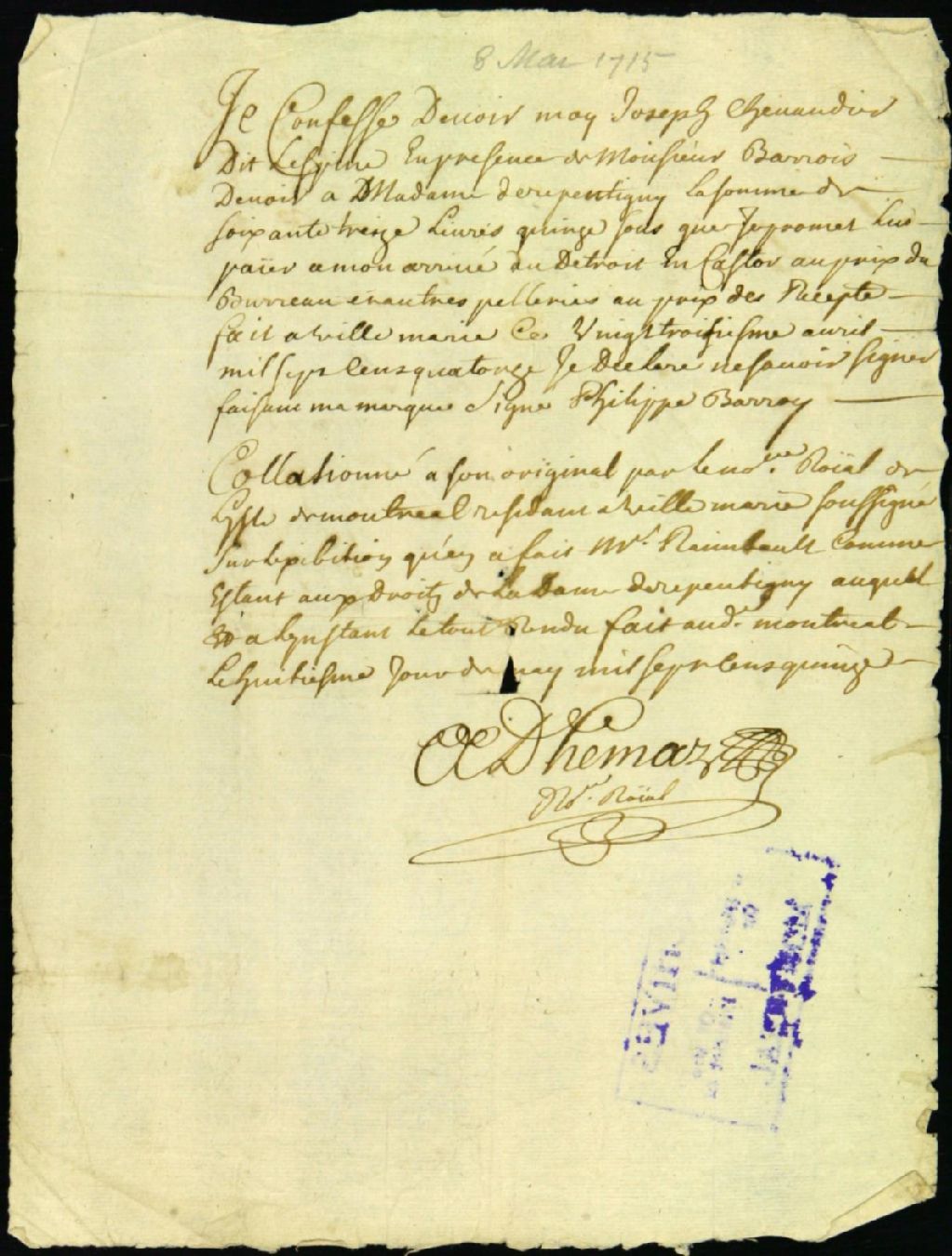Ce dossier de matière privée est composé de la collation d'un billet daté du 23 avril 1714 émis par Joseph Chevaudier dit Lépine pour 73 livres et 15 sols au nom de madame de Repentigny, payable à son retour de Détroit, en castors, au prix du bureau. Le billet est collationné à la requête de Raimbault comme ayant les droits de madame de Repentigny. Philippe Barrois est signataire de ce document