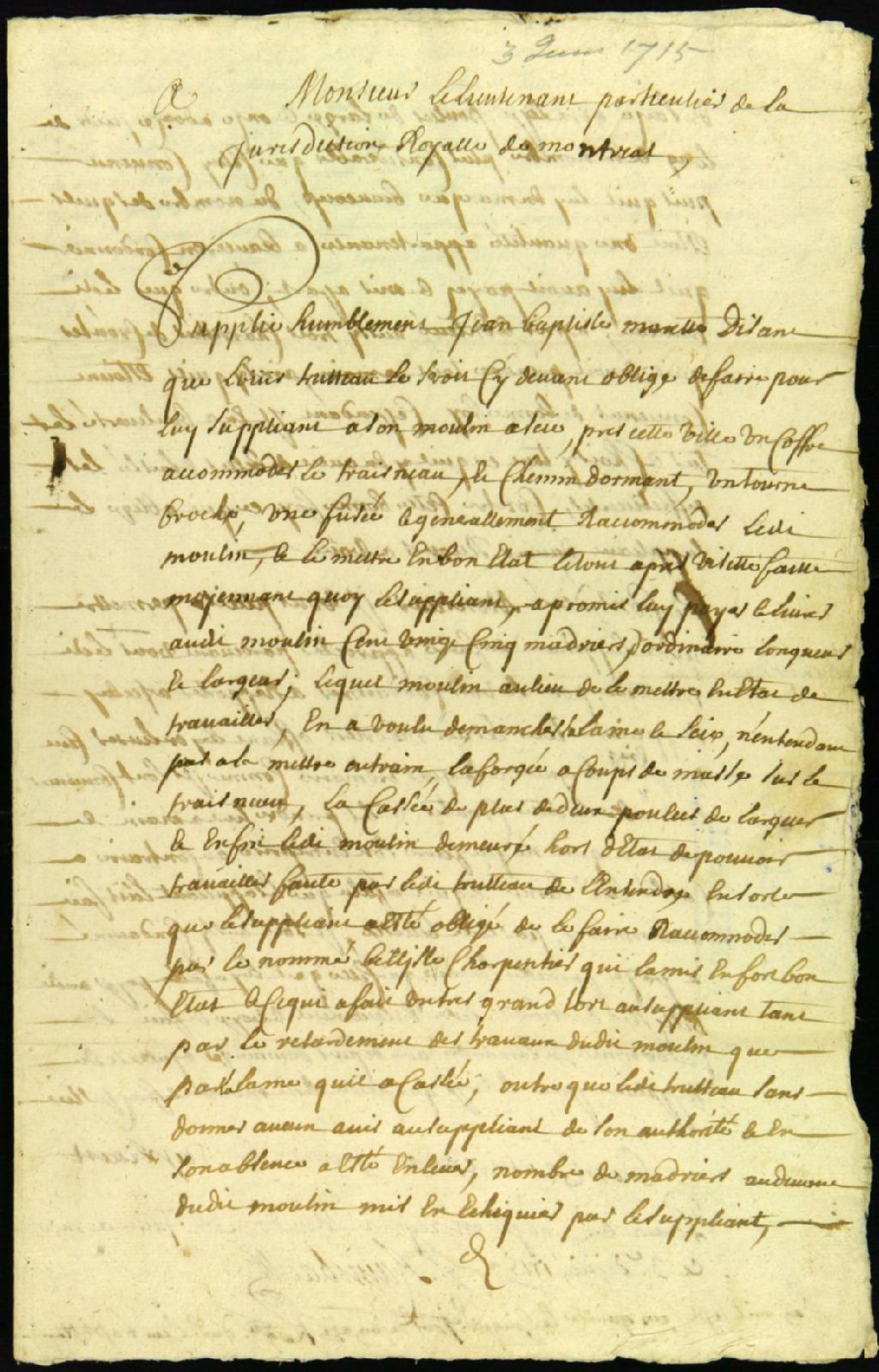 - Ce dossier de matière civile est composé des pièces suivantes : la requête de Jean-Baptiste Maret, représenté par sa femme Barbe Massault, pour faire approcher Louis Trudeau afin de lui rapporter les madriers qu'il a emporté sans permission de son moulin à scie en compensation pour des services de réparation de poulie ; la permission de faire approcher les parties ; la signification et les assignations servies aux témoins de la défense, à Maret et à Trudeau et le jugement ordonnant à ce dernier de prouver qu'il avait la permission d'emporter les madriers en question