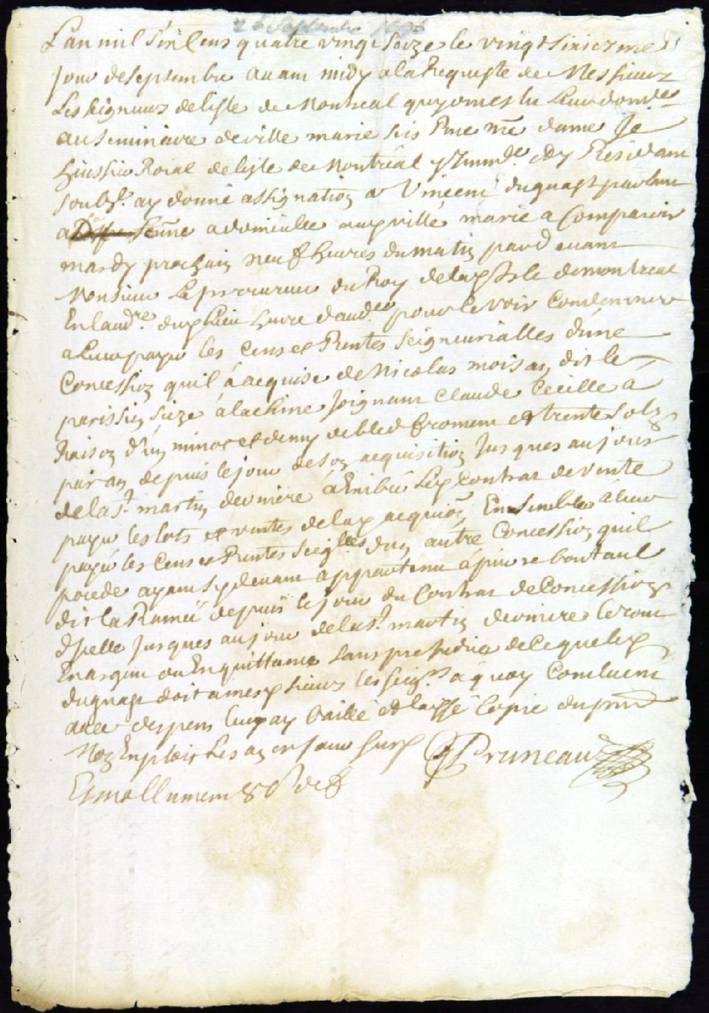 Procès entre Messieurs les seigneurs de l'île de Montréal, demandeurs, et Vincent Dugas, défendeur, pour le paiement des " cens & rentes " d'une concession acquise de Nicolas Moison dit Leparisien à Lachine