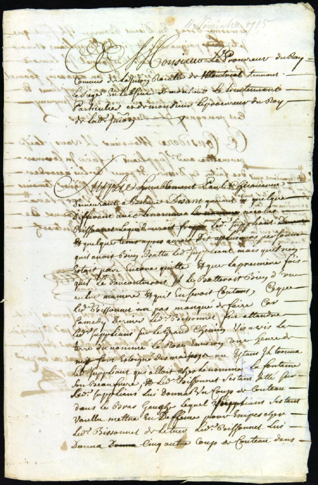 - Ce dossier de matière criminelle se compose des pièces suivantes : la plainte et demande d'une information de Paul Chicoine, à l'effet qu'il a été agressé la nuit sur le chemin par Nicolas Bissonnette avec qui il avait eu un différend dans le passé et qu'au cours de l'agression il a été blessé à coups de couteau aux bras ; la permission de faire informer et d'obtenir le rapport d'un chirurgien ; les assignations à comparaître aux témoins de la poursuite ; l'information judiciaire ; le réquisitoire pour "l'adjournement" de l'accusé Bissonnet et l'ordre "d'adjournement". Les documents mentionnent les témoins suivant : Nicolas-Antoine Coulon de Villiers, lieutenant, âgé de 32 ans ; Jean-Baptiste Jarret de Verchères, enseigne, âgé de 29 ans ; Gabriel Artigala dit Ladouceur, 46 ans, sergent de Jordy ; et François Chagnon dit Larose, habitant de Verchères