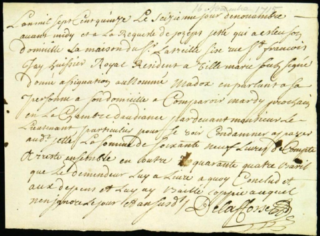 Procès entre Joseph Jetté, demandeur, et [Madore ?], défendeur, pour payement d'un compte arrêté, 16 novembre 1715, Archives nationales à Montréal, Fonds Juridiction royale de Montréal, (06M,TL4,S1,D1810).