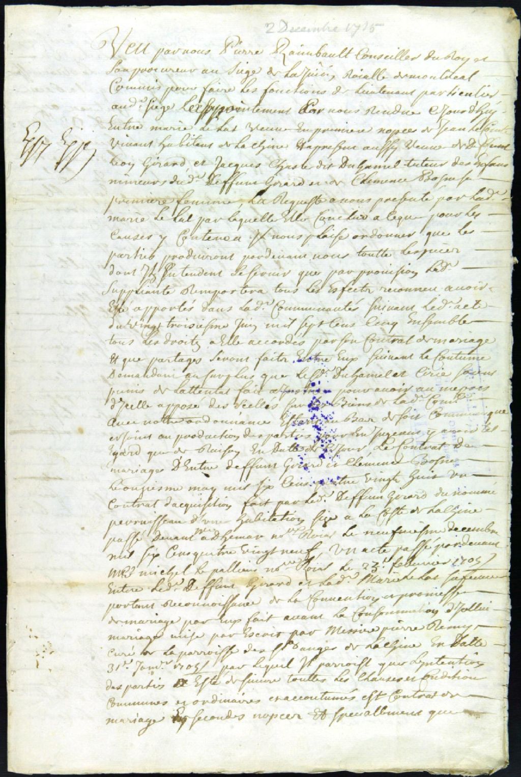 - Ce dossier de matière civile se compose des pièces suivantes : le dictum de sentence de distribution des biens de feu Léon Girard dans une poursuite intentée par Marie Lat contre Jacques Chasle et le procès-verbal du serment des arbitres nommés pour faire le partage de la terre de la côte de Lachine. Les arbitres sont alors Claude Cécire et Louis Fortier, tous deux de Côte-de-Lachine. Le dossier comprend aussi l'acte de départ pour le Conseil Supérieur de Québec par Duhamel et Angélique Girard, lesquels se portent appelant de la sentence rendue le 2 décembre à Montréal