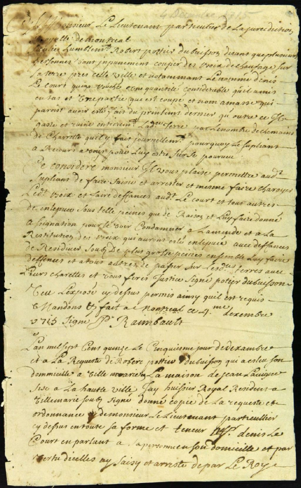 - Ce dossier de matière civile se compose de la requête de Robert de Poitiers, disant que plusieurs personnes viennent prendre du bois sur ses terres, sans permission, et qu'un nommé Denis Lecours y a bûché une quantité considérable qu'il a emporté en charrette à la ville. Il demande la permission de faire assigner Lecours à comparaître à l'audience pour se faire rembourser ou obtenir la restitution du bois. La signification, l'assignation et la saisie du bois complètent le dossier