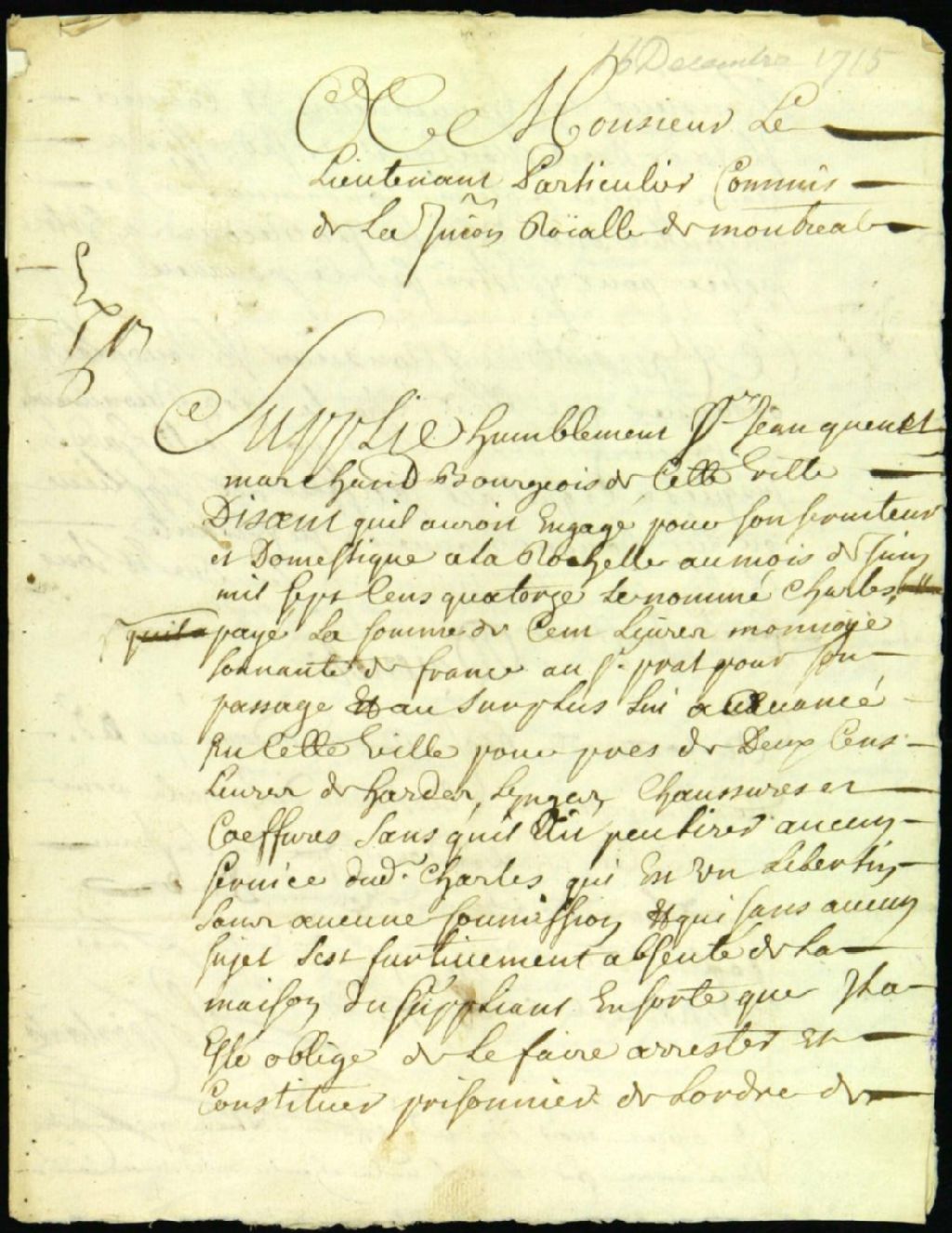 Procès entre Jean Quenet, marchand, bourgeois, plaignant, et son domestique, Charles Bellon, accusé de désertion et libertinage, 16 décembre 1715 - 18 décembre 1715, Archives nationales à Montréal, Fonds Juridiction royale de Montréal, (06M,TL4,S1,D1833).