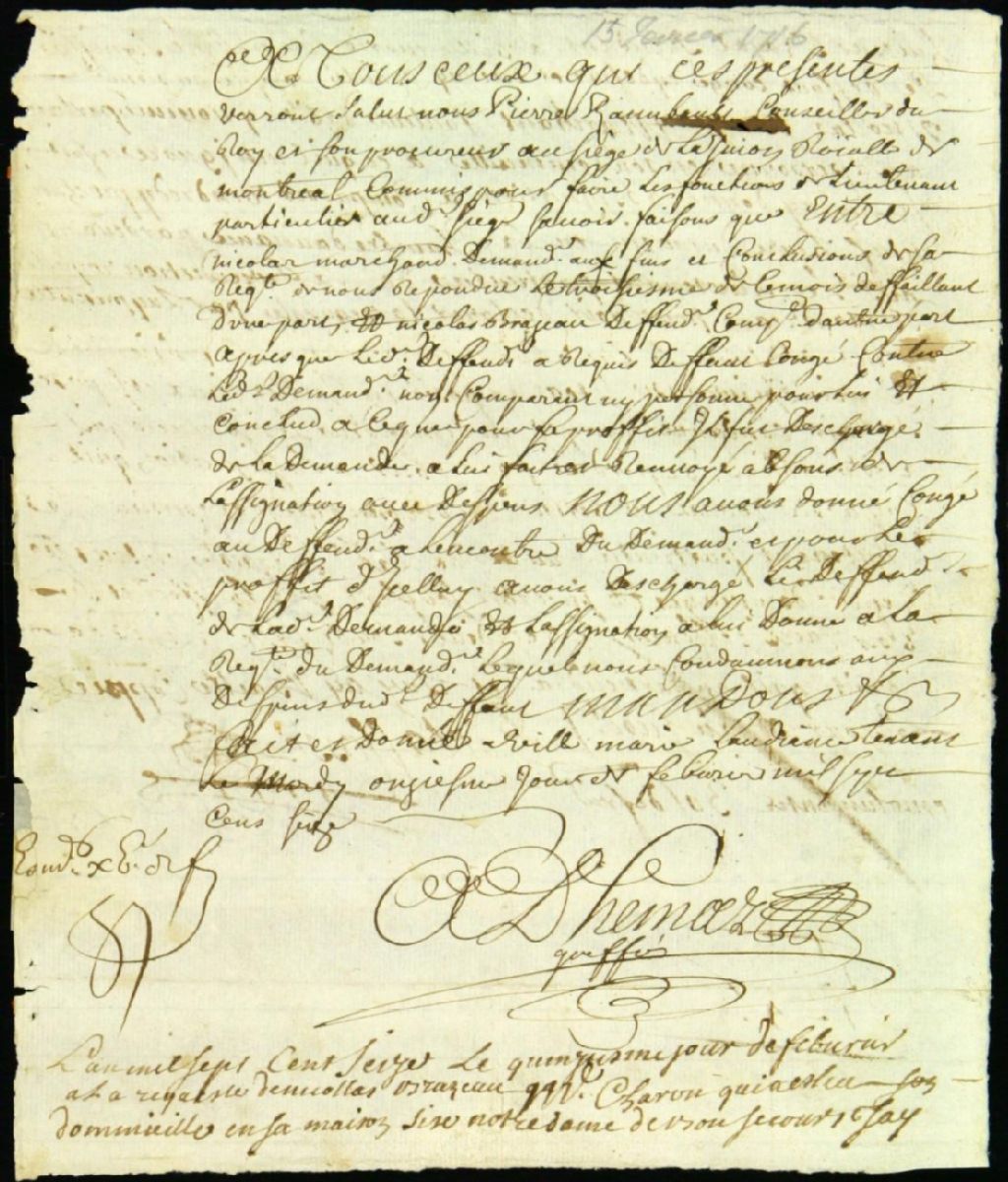 - Ce dossier de matière civile se compose des pièces suivantes : la transcription d'un jugement par défaut accordé à Nicolas Brazeau, pour non comparution de Nicolas Machand ; la signification du congé accordé par jugement, servi à Nicolas Marchand et l'assignation pour payer au défendeur ses journées perdues pour sa comparution
