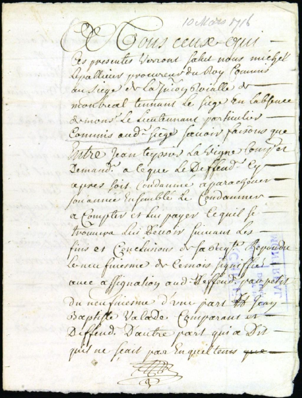 Procès entre Jean Tessier dit Lavigne, demandeur, et Jean-Baptiste Valade, garçon volontaire, défendeur, pour le respect d'un marché d'engagement