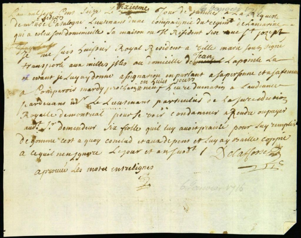 Procès entre Gédéon de Catalogne, lieutenant, demandeur, et Jean Lapointe, défendeur, pour la restitution ou le remboursement de fioles empruntées, 6 janvier 1716, Archives nationales à Montréal, Fonds Juridiction royale de Montréal, (06M,TL4,S1,D1894).