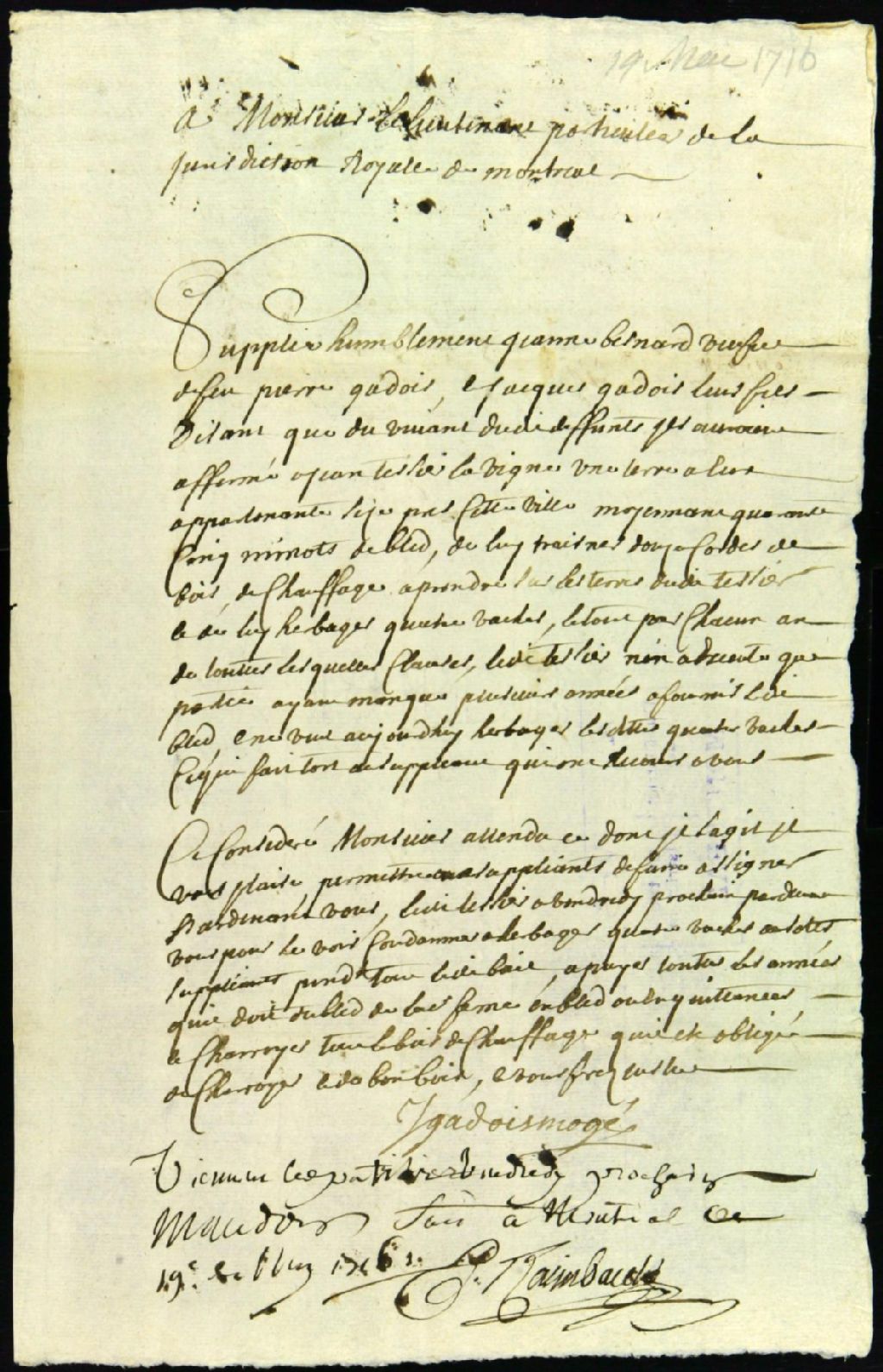 - Procès entre Jeanne Bénard, veuve de Pierre Gadois, et son fils Jacques Gadois, demandeurs, et Jean Tessier dit Lavigne, défendeur, pour le paiement de droits de fermage