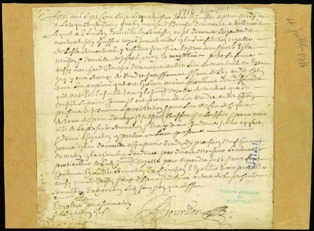 Procès entre Henri Catin, boucher, demandeur, et Joseph Gagnon, boucher, époux de Madeleine Petit, défendeur, pour la restitution de documents, 4 juillet 1716, Archives nationales à Montréal, Fonds Juridiction royale de Montréal, (06M,TL4,S1,D1951).