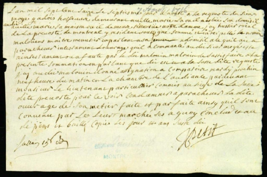 - Ce dossier de matière civile se compose de l'assignation servie à un nommé Malouin à la requête de Jacques Gadois dit Mauger pour l'obliger à parachever l'ouvrage qu'il a commencé