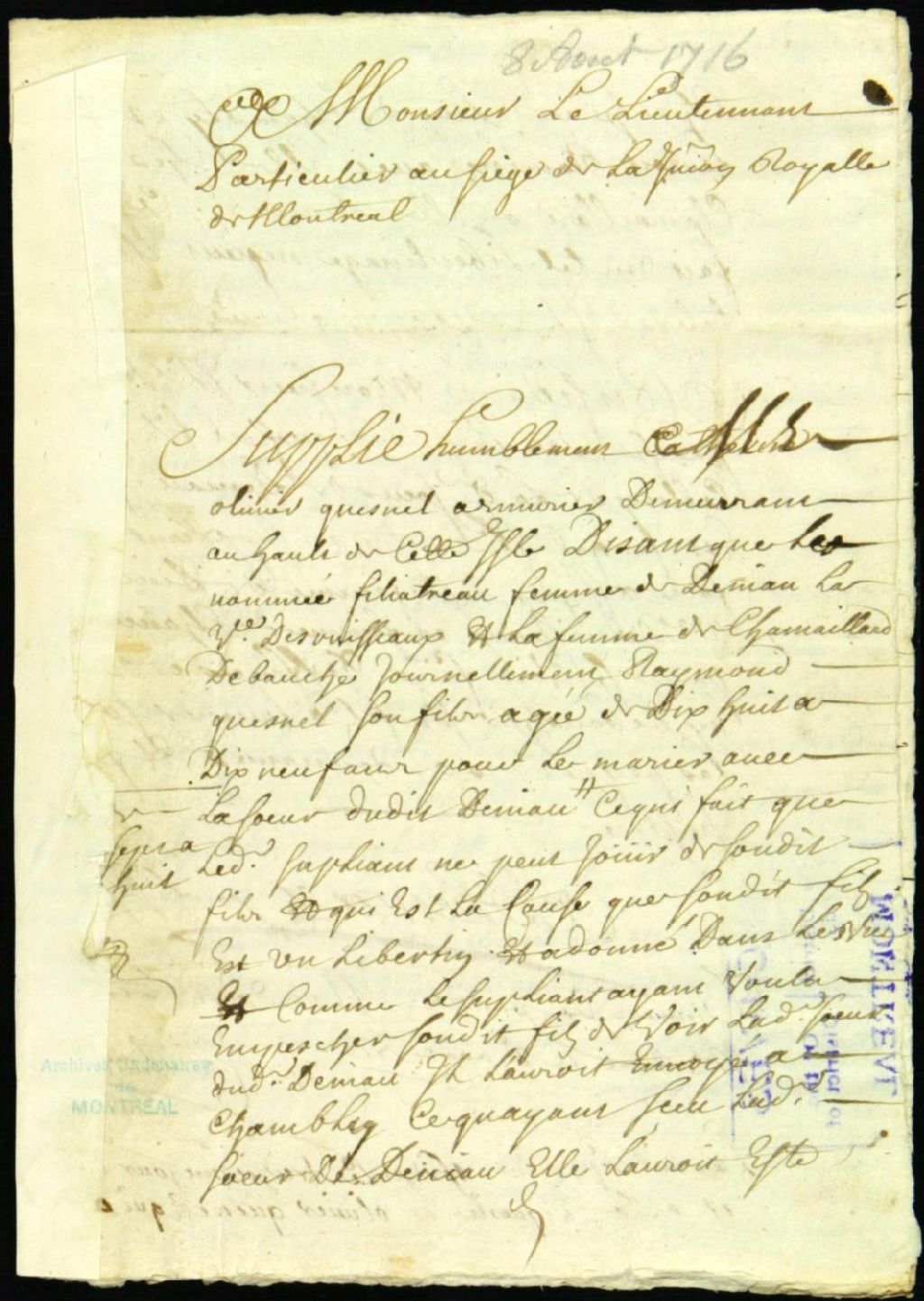 - Ce dossier de matière criminelle se compose d'abord de la requête de Olivier Quesnel disant que Catherine Thunay et Marie Matou ont débauché son fils Raymond, âgé de 18 ans, et l'hébergent en vue de lui faire épouser Jeanne Haudecour. Il demande le retour de son fils pour l'aider au travail. Le dossier contient aussi : les assignations servies aux défenderesses et à la veuve DesRuisseaux ; le dictum de sentence qui annule le mariage entre Raymond Quesnel et Jeanne Haudecoeur ; et les appels de sentence de Catherine Thunay, procuratrice de Jeanne Haudecoeur, et de cette dernière contre la sentence d'annulation de mariage
