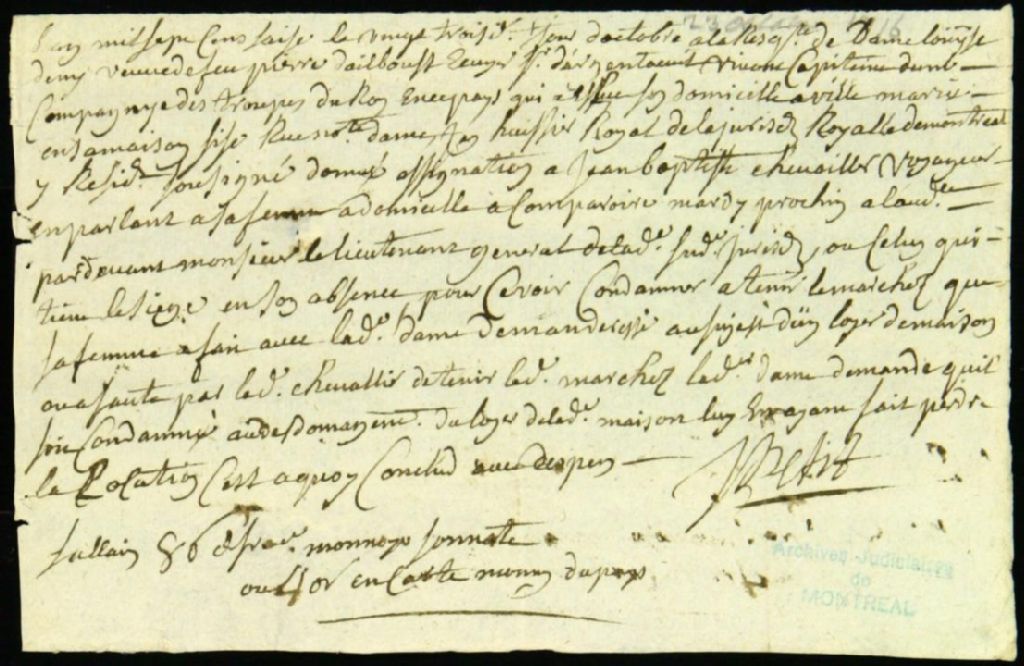 - Procès entre Louise Denis, veuve de Pierre d'Ailleboust, sieur d'Argenteuil, demanderesse, et Jean-Baptiste Chevalier, époux de Marie-François Alavoine, voyageur, défendeur, pour le respect d'un marché