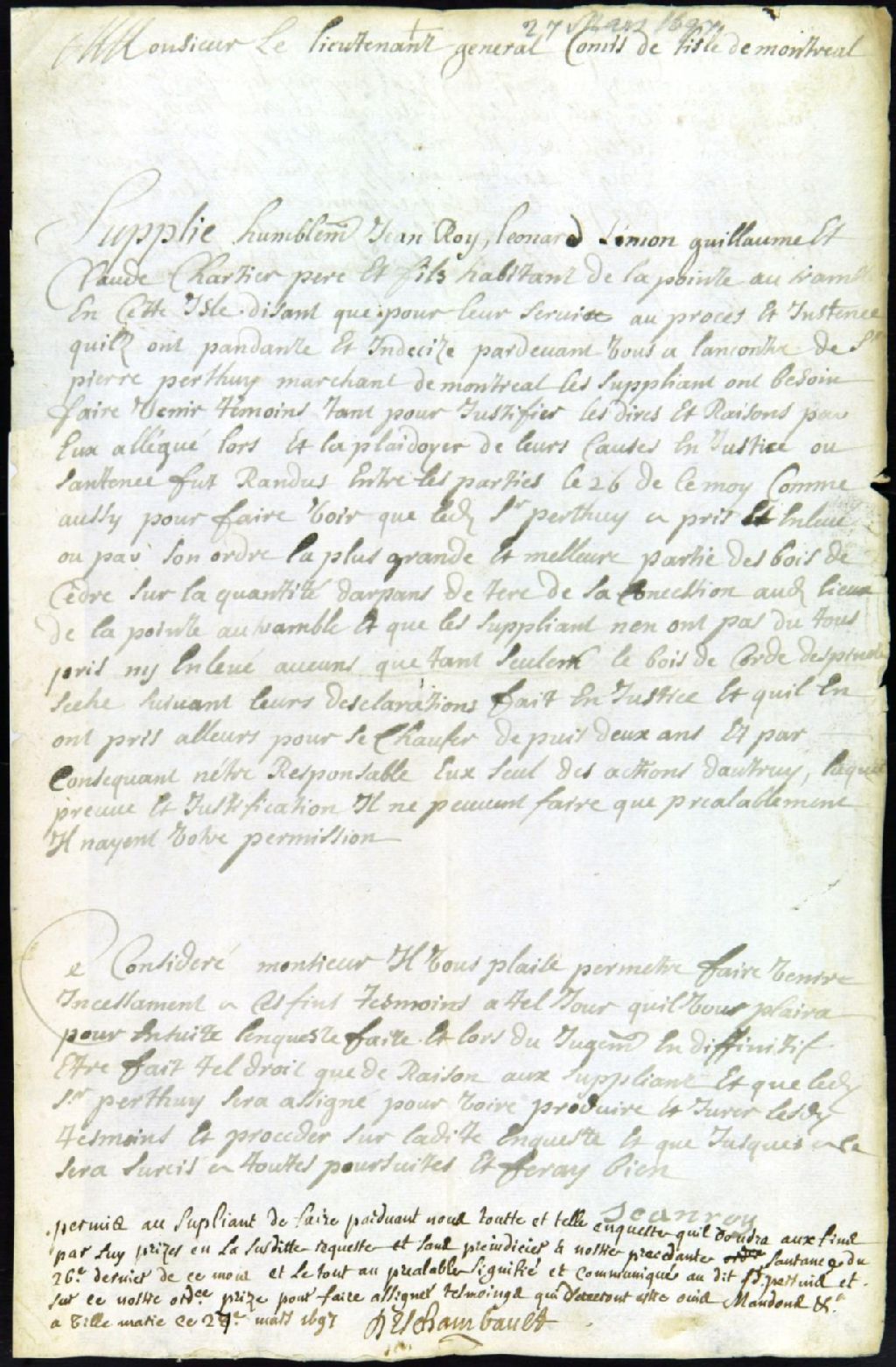 - Procès entre Jean Roy, Léonard Simon, Guillaume et Claude Charretier, demandeurs, et sieur Pierre Perthuis, marchand, défendeur, pour prouver que ce dernier a pris la meilleure partie des bois de cèdre sur sa concession, et que les demandeurs n'ont pris que du bois de chauffage